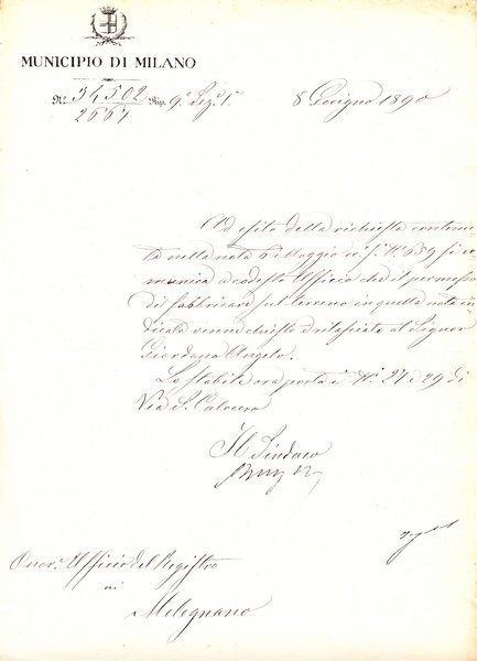 lettera manoscritta e firmata di Giulio Belinzaghi di 1 facciata datata 8 giugno 1890 su carta intestata "Municipio di Milano"; buon es. piccoli strappi laterali.