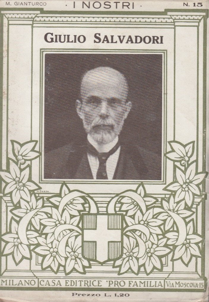 In-16 (Cm 17,3 x 12,2), pp. 75, brossura editoriale illustrata. Collana I Nostri 15 dedicata a personalità cattoliche più cospicue e meritevoli nel campo dell'apostolato religioso, dell'azione cristiano-sociale, della politica, della scienza, dell'arte e della beneficenza. Normali segni del tempo. OTTIMO - Giulio Salvadori: Monte San Savino 1862 - Roma 1928 fu un poeta, critico letterario, giornalista, educatore e docente italiano