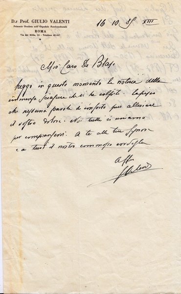 Giulio Valenti. Professore universitario di Medicina a Camerino, Perugia, Catania e Bologna. Lettera manoscritta e firmata.