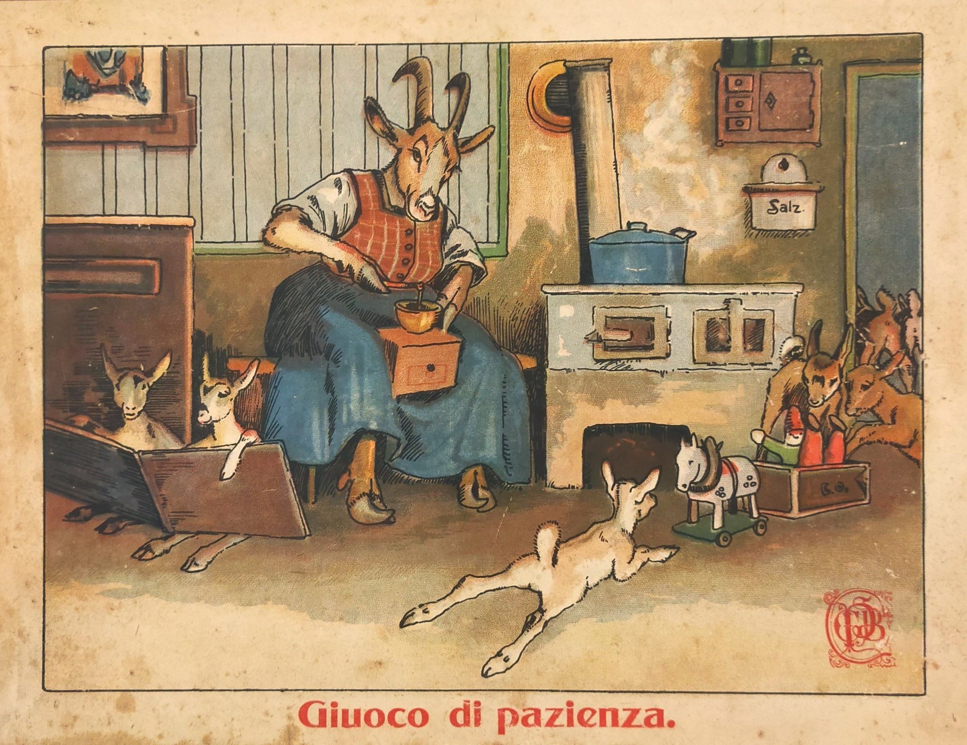 Cm. 23 x 30, scatola editoriale (con manc. ai lati; lievi fioriture): al piatto una scena a colori presa dalla celebre fiaba dei Fratelli Grimm, Il Lupo e i sette capretti. Vi sono contenuti 80 pezzi di puzzle in legno che compongono 4 scene diverse della fiaba: il lupo che bussa alla porta - la mamma capra in cucina intenta a macinare il caffé mentre alcuni capretti giocano, leggono, etc. - i capretti che fuggono e si nascondono nella camera da letto - la mamma e i sette capretti mentre danzano felici, intorno al pozzo. Puzzle completo con i relativi fogli d'insieme per aiutare il bimbo a comporre le scene animate. Bellissimo gioco di pazienza, ben conservato.