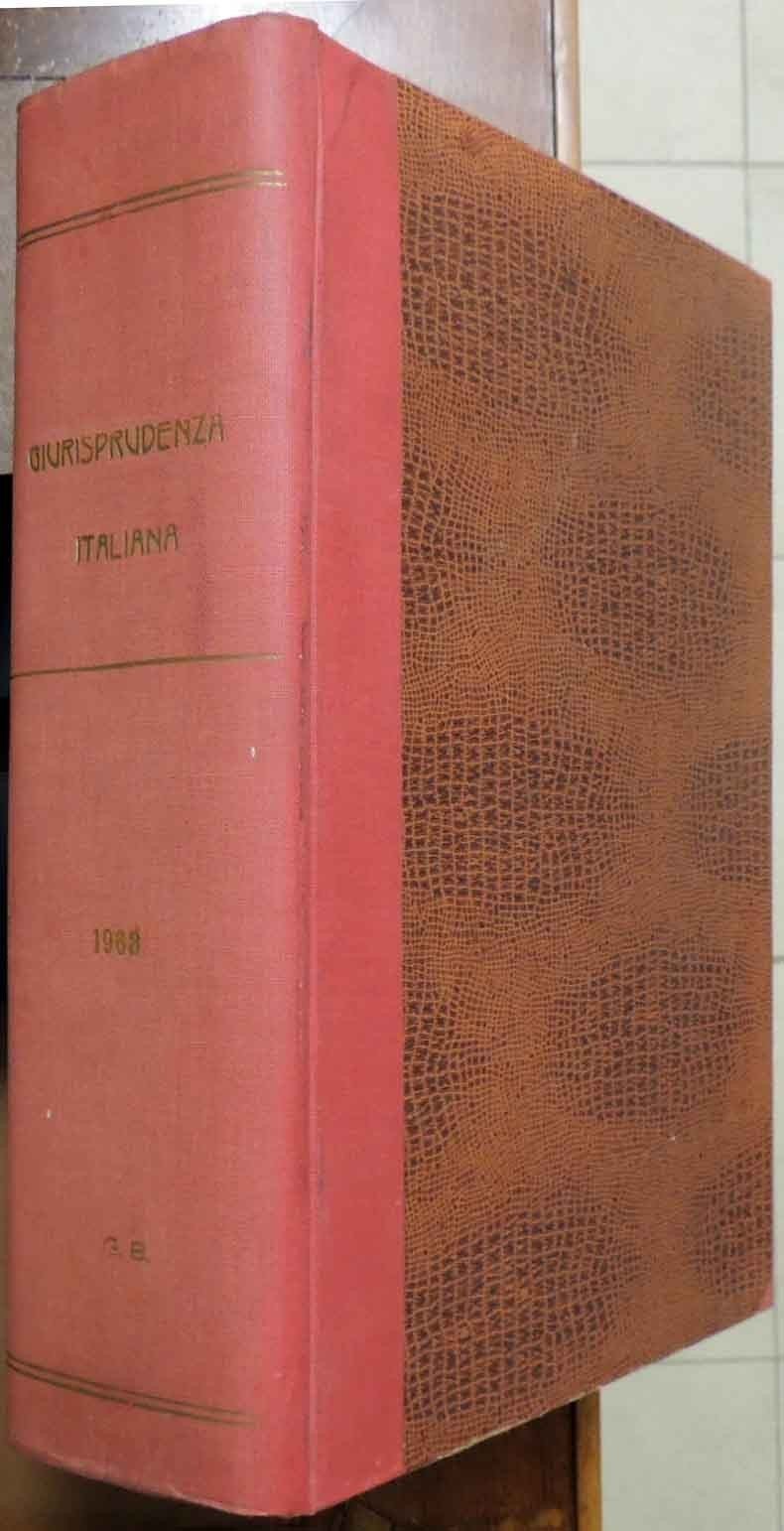 Giurisprudenza italiana e La legge. Rivista universale di giurisprudenza e dottrina con Repertorio generale annuale di giurisprudenza, dottrina e legislazione (Giurisprudenza Italiana, serie settima, anno CXV – La legg, serie settima, anno CIII – Rivista Universale, anno LXXVII), comitato scientifico e giudiziario Silvio Tavolaro et al., direzione Enrico Allorio et al., anno 1963 (volume CXV), annata completa rilegata in un unico tomo, Unione Tipografico-Editrice Torinese (già Ditta Pomba), Torino 1963, paginazione varia per un totale di pp. 3251 disposte su due colonne, cm 30, elegante legatura in mezza tela con titoli entro filetti in oro al dorso. Sigla d’appartenenza al dorso. Qualche sgualcitura, qualche sporadica traccia di lapis e biro, uniforme brunitura della carta, per il resto copia molto buona con bella e solida legatura.