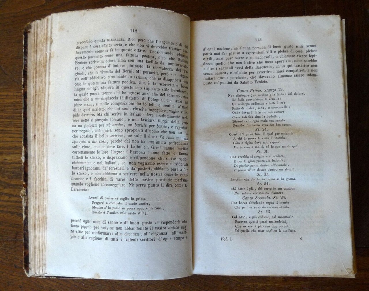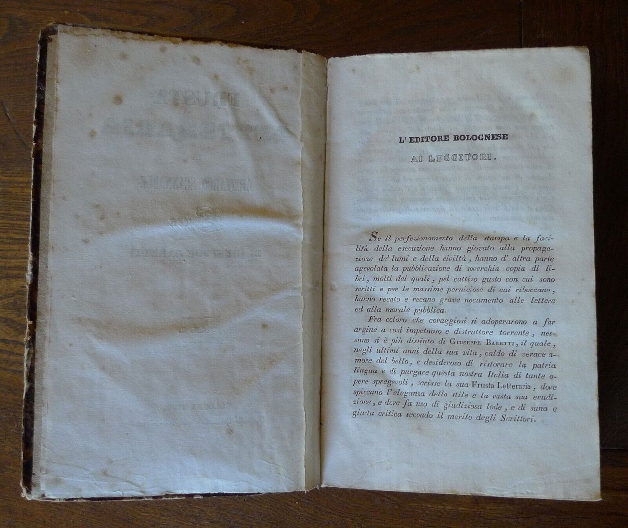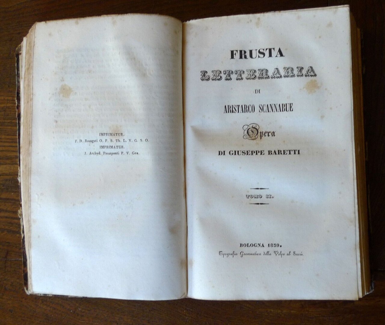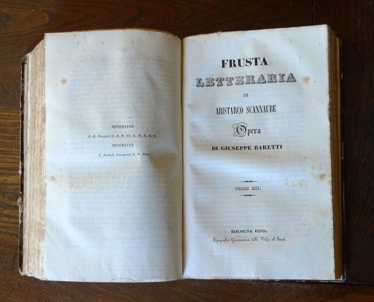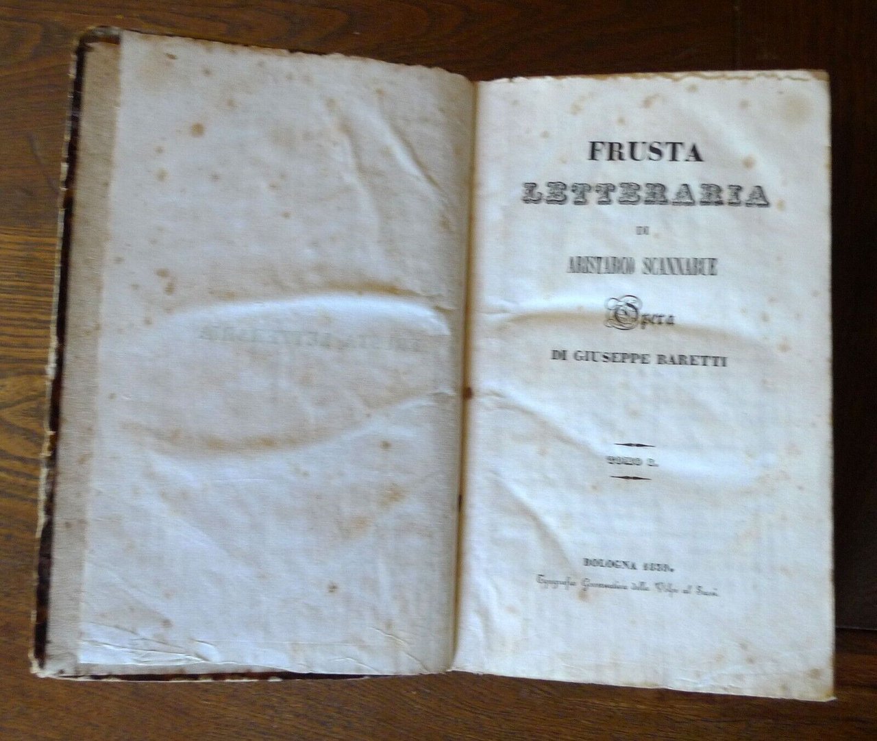FRUSTA LETTERARIA DI ARISTARCO SCANNABUEOPERA DI GIUSEPPE BARETTI.TOMO ITOMO IITOMO III[3 TOMI RILEGATI IN UN UNICO VOLUME,OPERA COMPLETA].BOLOGNA 1839,Tipografia Governativa della Volpe al Sassi,copertina rigida, rilegatura coeva in mezza pelle,22x13,5 cm., pp.257; 279; 231,peso: g.850