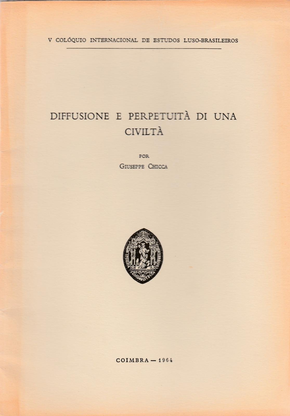 GIUSEPPE CHICCA DIFFUSIONE E PERPETUITA' DI UNA CIVILTA' COIMBRA 1964†N. PAG. 22 CM. 24 X 17†L 4572 COPERTINA EDITORIALE MORBIDA CON ALONE AL MARGINE, UNA LEGGERA PIEGA CENTRALE AL PIATTO ANTERIORE, INTERNO IN BUONO STATO,