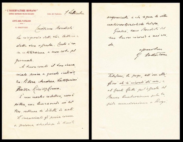 lettera manoscritta e firmata di Giuseppe Dalla Torre di 2 facciate datata Città del Vaticano, 1 Settembre su carta intestata "L'Osservatore Romano, il Direttore"; buon es.