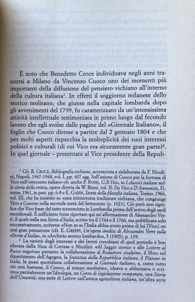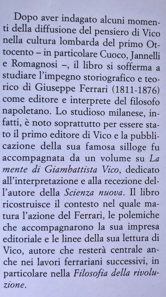 Soggetti: Giambattista Vico, Fortuna, Lombardia, Secolo 19, Stampa, Editoria, Cultura lombarda, Napoli, Filosofia, Critica, Storia locale, Storiografia, Pubblicazioni, Opere, Vincenzo Cuoco, Jannelli, Romagnosi, Benedetto Croce, Silloge, Scienza Nuova, Rivoluzione, 1799, Giornale Italiano, Repubblica Partenopea, Bibliografia, Francesco Predari, Francia, Vichismo, Polemica editoriale, Verum factum, Filologia, Le Clerc, Bayle, Sublime, Galiani, Orazio, Leibniz, Storicismo, Provvidenza, Lomonaco, Tessitore, Piovani, Carafa, Fausto Nicolini, Mente, Pensiero filosofico, Critica, Interpretazione, Studi culturali, Michelet, Lerminier, Platone, Machiavelli, Ballanche, Cattaneo, Intellettuali napoletani, Libri Vintage Fuori catalogo, Saggi, Fortuna, Lombardy, 19th century, Press, Publishing, Lombard culture, Naples, Philosophy, Criticism, Local history, Historiography, Publications, Works, Silloge, New Science, Revolution, Italian newspaper, Parthenopean Republic, Bibliography, France, Vikingism, Editorial controversy, Philology, Horace, Historicism, Providence, Mind, Philosophical thought, Criticism, Interpretation, Cultural studies, Neapolitan intellectuals, Out of print books, Essays