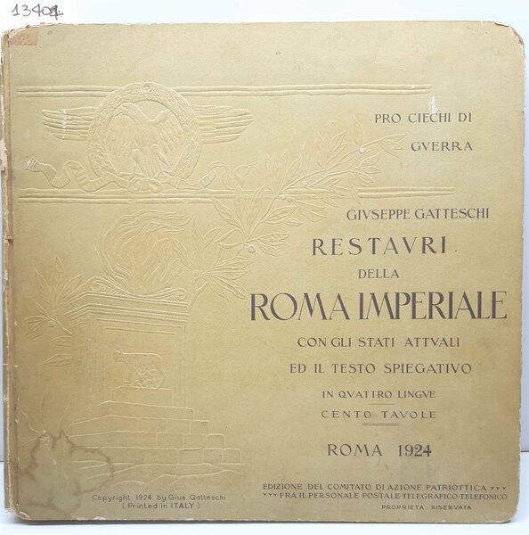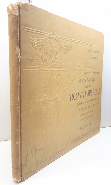 in condizioni precarie, copertina in condizioni accettabili, piatti con angoli arrotondati con piccole mancanze, un alone di umidit‡ al margine inferiore del piatto anteriore e un segno di nastro adesivo al margine superiore, dorso con piccole spellature e mancanze, quarta di copertina con alcuni aloni e macchie, tagli bruniti impolverati quelli superiori, fogli di guardia decorati, interno in buono stato, due tavole del Monte Capitolino Foro Romano e monumenti circostanti ripiegate all'interno, numero pagine 100 + 2 alcune lievissime fioriture al margine inferiore alle ultime pagine