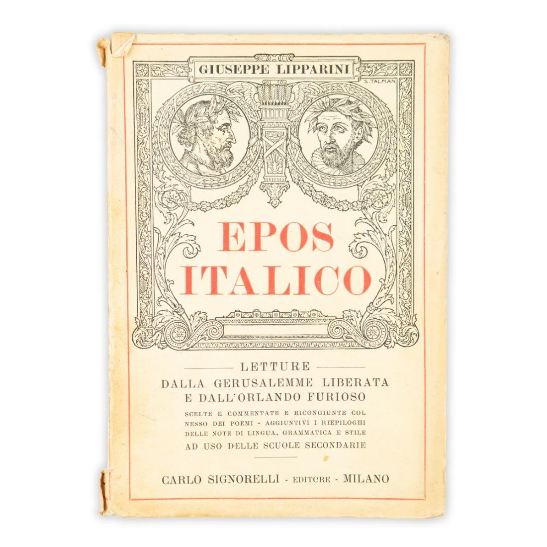 Autore: Giuseppe Lipparini Titolo: Epos Italico Sottotitolo: Letture - Dalla Gerusalemme Liberata e dall'Orlando Furioso Edizione: Carlo Signorelli - Editore - Milano 1935 Dimensioni: 14 x 20 cm c.a. Pagine: 257 Copertina: Brossura Condizioni: Buone come da foto