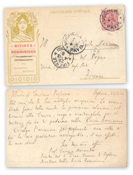 Giuseppe Morando (1866, 1914). Professore universitario, scrittore rosminiano. Scrisse numerosi testi su Rosmini e il Rosminanesimo. Cartolina scritta e firmata.