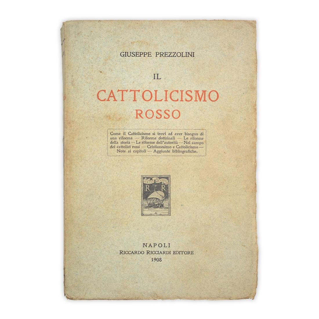 Autore: Giuseppe Prezzolini Titolo: Il Cattolicismo rosso Sottotitolo: Studio sul presente movimento di riforma nel Cattolicismo Edizione: Riccardo Ricciardi Editori - Napoli 1909 Dimensioni: 13,5 x 19,5 cm c.a. Pagine: 348 Copertina: Brossura Condizioni: Buone come da foto