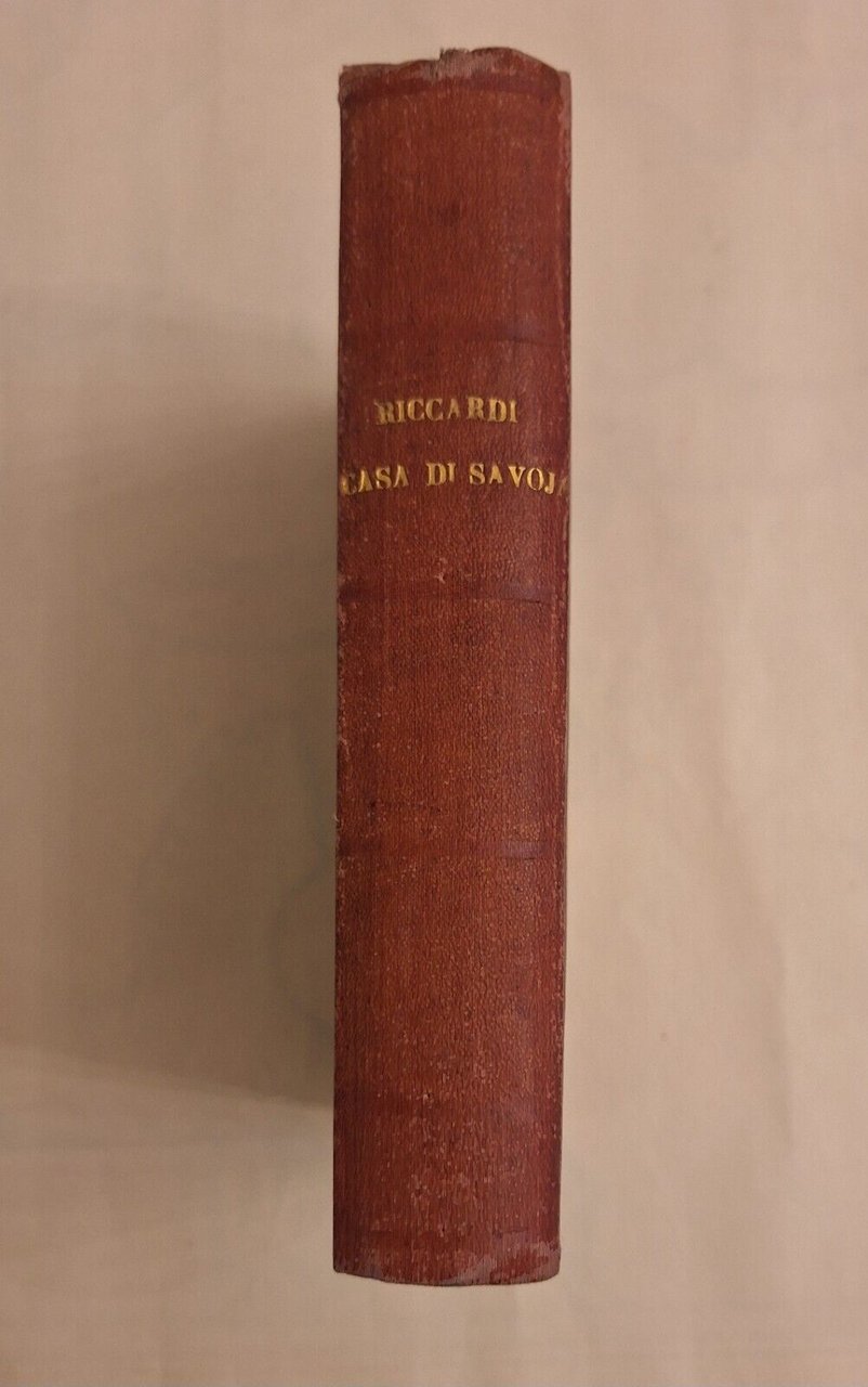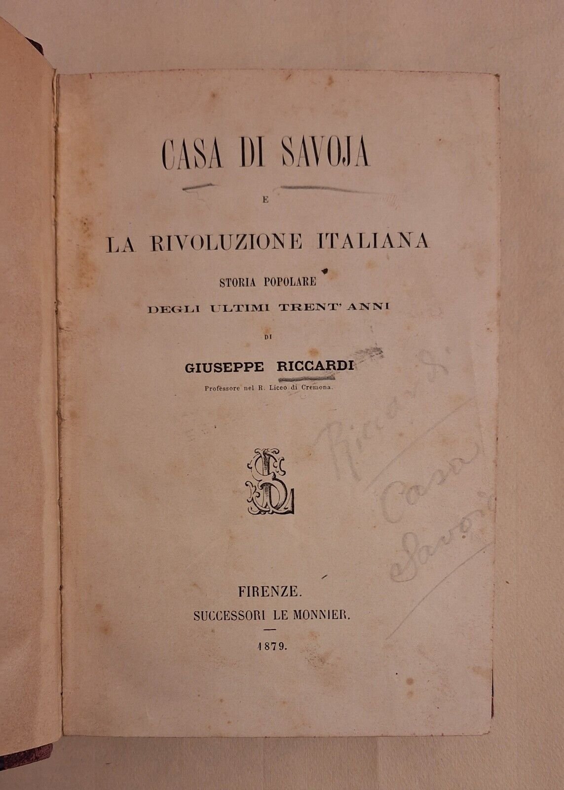 GIUSEPPE RICCARDI CASA DI SAVOIA E LA RIVOLUZIONE ITALIANA LE MONNIER 1879In 8°, legatura in mezza tela con titolo in oro al dorso.Lievi segni alla legatura, tenui macchie alla pagina 1/2.