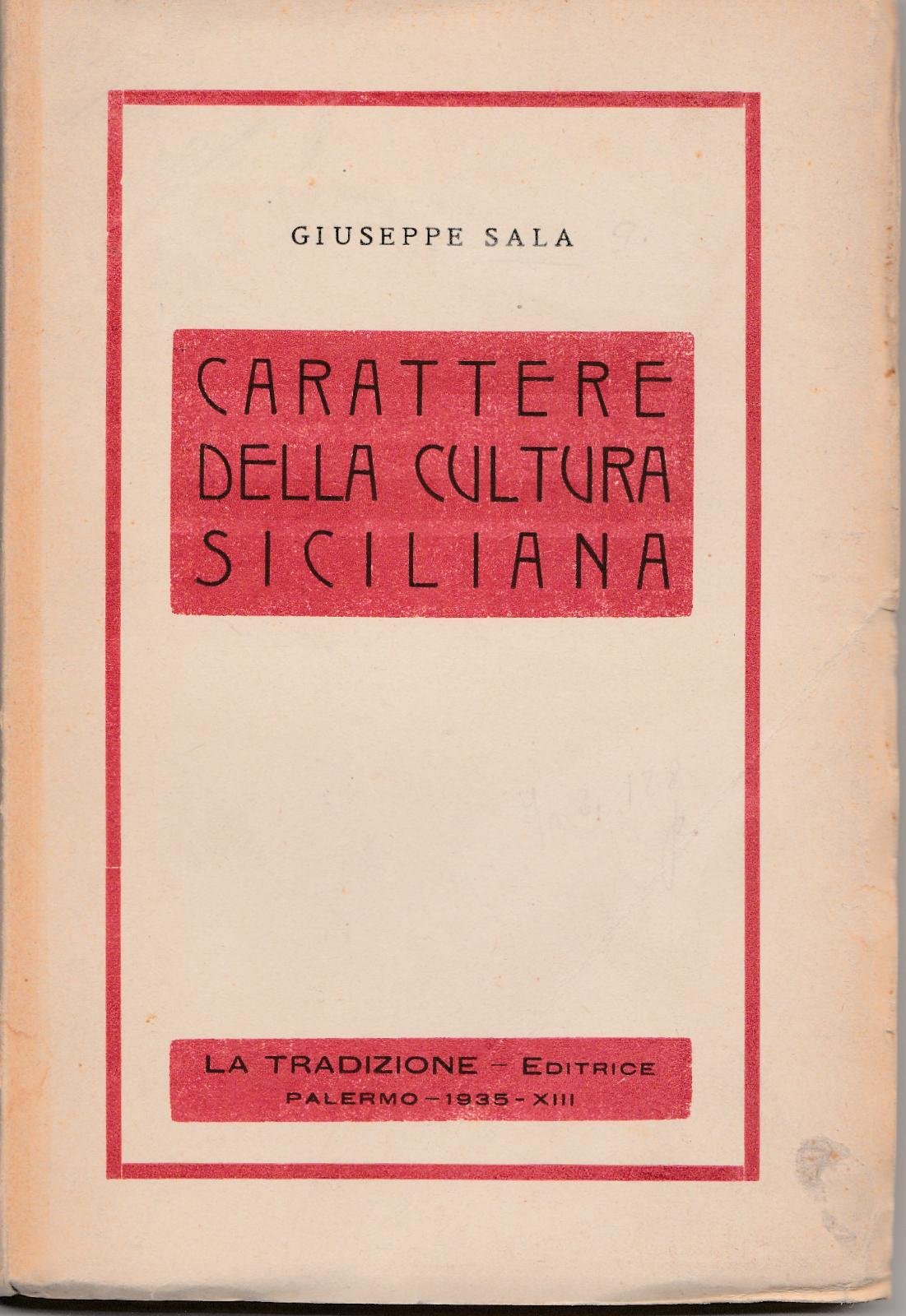 GIUSEPPE SALA CARATTERE DELLA CULTURA SICILIANALA TRADIZIONE ED. 1935L4348 COPERTINA MORBIDA EDITORIALE CON UNA PIEGA ALL'ANGOLO INFERIORE DESTRO E PIEGHE AI MARGINI ESTERNI DEI PIATTI, DORSO LIEVEMENTE BRUNITO, TAGLI IRREGOLARI, INTERNO IN BUONO STATO N. PAG 128 CM. 19 x 13