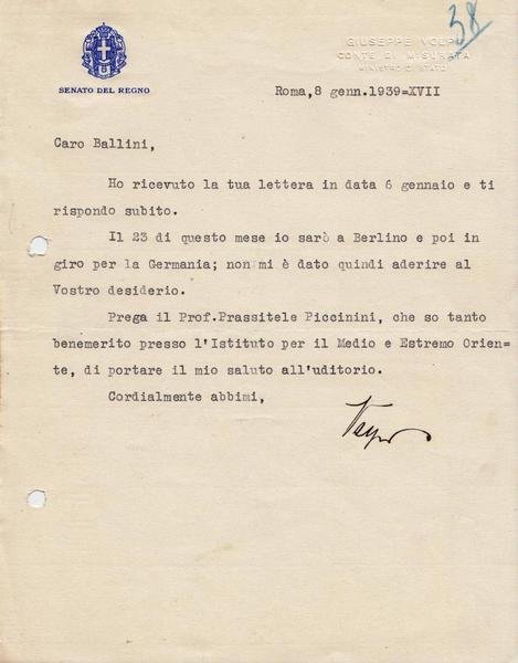 comunicazione firmata di Giuseppe Volpi datata Roma, 8 gennaio 1939 su carta intestata "Senato del Regno"; ottimo es.