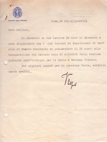comunicazione firmata di Giuseppe Volpi di 1 facciata datata Roma, 20 Dicembre 1939 su carta intestata Senato del Regno; buon es.