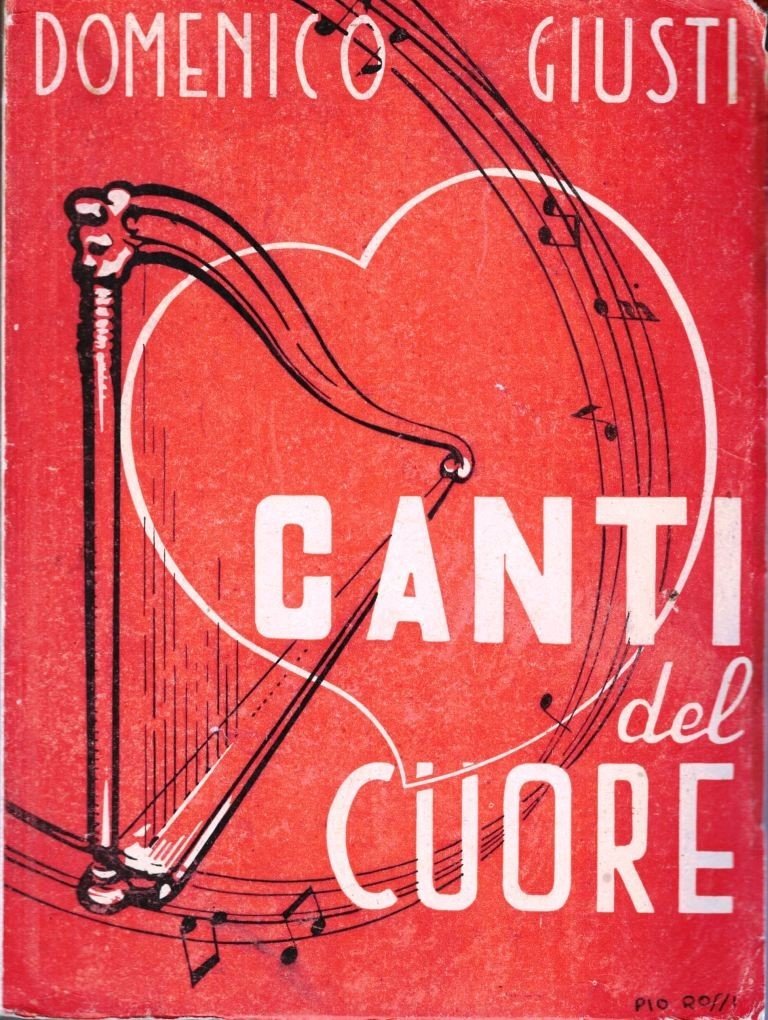 Domenico Giusti, Canti del cuore. Poesie Auguri Sonetti, STOS Scuola Tipografica Orfanotrofio Salesiano, Bari 1950, pp. 172, 1 c. di tavv. f.t. in antiporta ill. b.n. con ritratto dell’autore, cm 22, br. ed. Raccolta di poesie, prevalentemente a tematica religiosa, di Domenico Giusti (Bitritto, 1886-1959), sacerdote e professore di italiano e latino negli istituti superiori. Il volume raccoglie l’intera produzione poetica dell’Autore. Firma dell’autore all’ultima carta. Leggere tracce d’uso alla brossura, minime fioriture, per il resto buona copia.