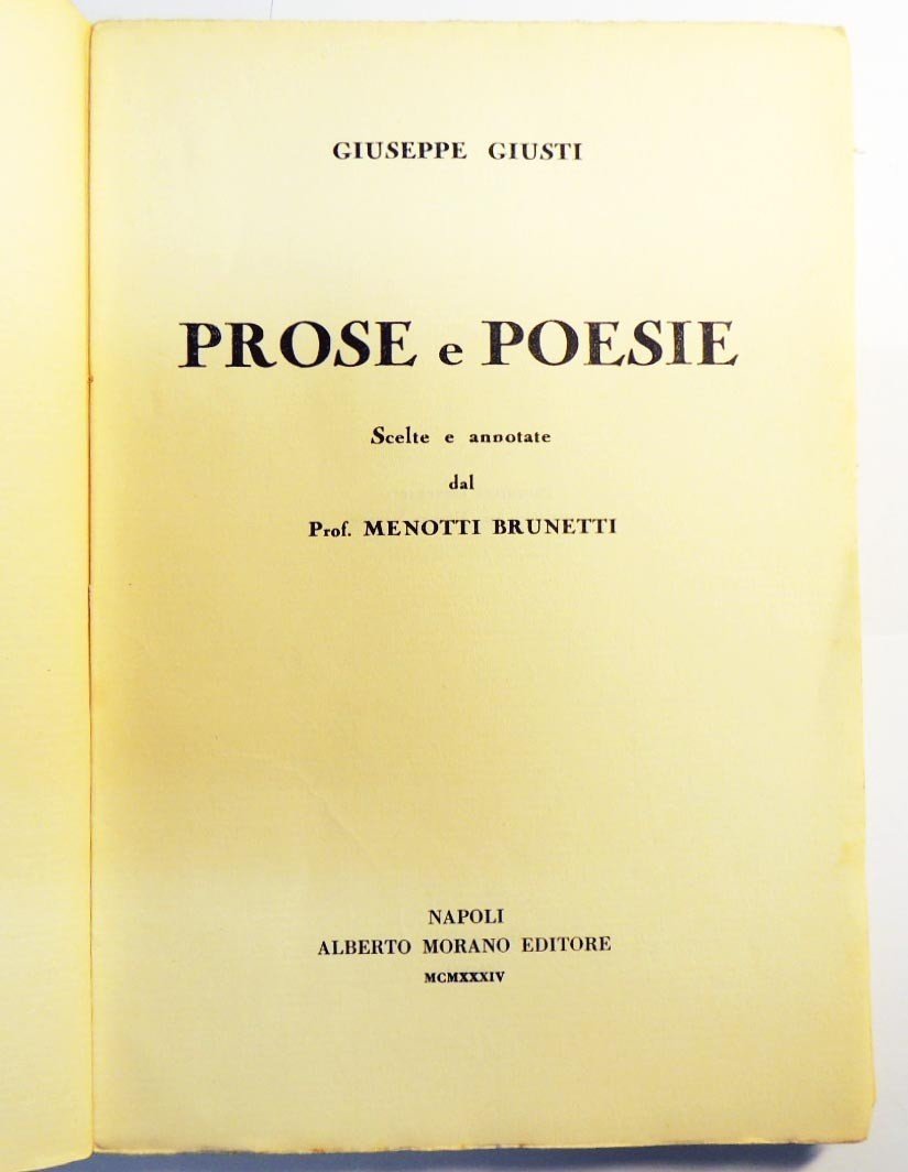 Giuseppe Giusti, Prose e poesie. Scelte e annotate dal prof. Menotti Brunetti, Alberto Morano Editore, Napoli 1934, pp. 166, cm 21, br. ed. Firma d’appartenenza alla copertina, uno strappetto al dorso, qualche segno di pastello, ultimo fascicolo un po’ allentato, per il resto esemplare in condizioni ancora accettabili e in parte intonso. Raro.