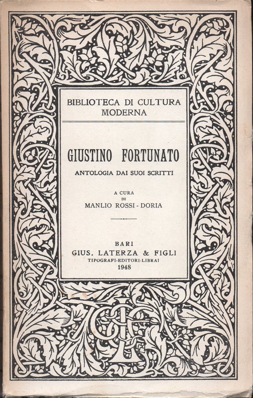 In-8° (20,2 x 12,5 cm), pp. XII, 276, (4), copertina editoriale. Normali segni d'uso e del tempo alla copertina, in particolare, lieve ingiallitura al dorso, probabilmente dovuta ad esposizione alla luce. Patina del tempo alle pagine, con leggere arrossature ai margini, dovute al tipo di carta. Per il resto, ben conservato. Volume numero 447 nella «Biblioteca di Cultura Moderna». Indice. Avvertenza. Nota biografica su Giustino Fortunato. Parte I. Don Giustino e il Mezzogiorno. Parte II. Lo stato italiano. Parte III. La guerra sovvertitrice.
