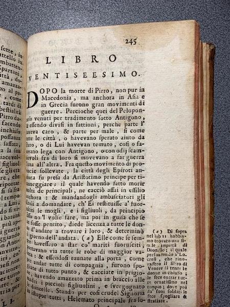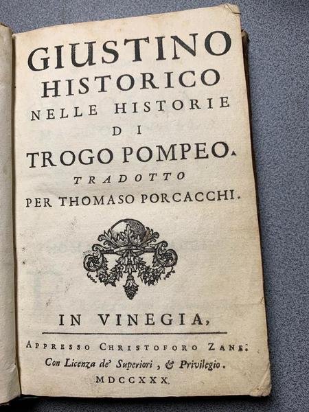 In 16° (cm 10,3 x 16), bella legatura piena pelle coeva, dorso con titoli e ricchi fregi in oro, buono stato di conservazione. Pp (32), 352, fregio al frontespizio, chiose marginali quando il volgarizzatore individua rapporti tra i fatti remotissimi e le vicende dei suoi tempi: le lotte tra principi italiani, le interrelazioni con potenti di tutta Europa tra fine XVI secolo e i suoi giorni, Milano, Verona, Lorenzo de' Medici, i principi degli Stati italiani, le leghe, le fazioni; esemplare in buone condizioni malgrado bruniture irregolari più intense all'ultima trentina di carte; rifilatura talvolta eccessiva ai lati, talvolta di sbieco, mai con perdita di testo anche se lo sfiora; le cc X2 e X3 presentano strappo con perdita di carta al margine superiore destro, con perdita di una lettera. Reimpressione veneziana settecentesca dell'opera degli storici Marcus Junianus Justinus (terzo secolo a. C.) e Trogus Pompeius (primo secolo a. C.), resoconti oscillanti tra il rigore storico e le trasposizioni biblioche, e spesso con queste confondentesi, a cura del miglior traduttore, il Porcacchi (1530-1585), umanista, letterato, storico, poeta, autore di importanti opere geografiche, curatore per Giolito de Ferrari di una collana di autori greci da lui stesso parzialmente volgarizzati, di una 'Vita' di Pio V. La volgarizzazione uscì in prima edizione nel 1561 appunto per il Giolito. Tre esemplari censiti in SBN.