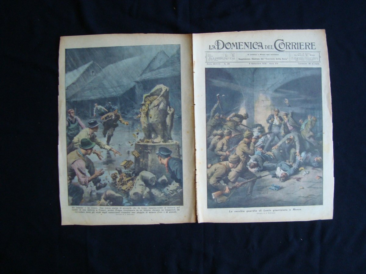 Settimanale, La vecchia guardia di Lenin giustiziata a Mosca" Grande illustrazione a colori alla prima pagina de "La Domenica del Corriere" Anno XXXVIII- Numero 36 Milano, 6 Settembre 1936 Milano 1936, cm 38,5x29, pp. 12 con varie ill. in b/n nel t.; prima e ultima pagina entrambe con una bella ill. a colori di A.Beltrme.Fogli sciolti. Numero completo. Condizioni di conservazione Esemplare in buone condizioni con tracce d'uso, alcune piccole lievi bruniture e qualche macchietta; dorso con piccoli strappetti, margini e angoli con qualche piccolo difetto.( vedi foto). Supplemento al "Corriere della Sera" Numero completo. SC03.D12954 BLU F "