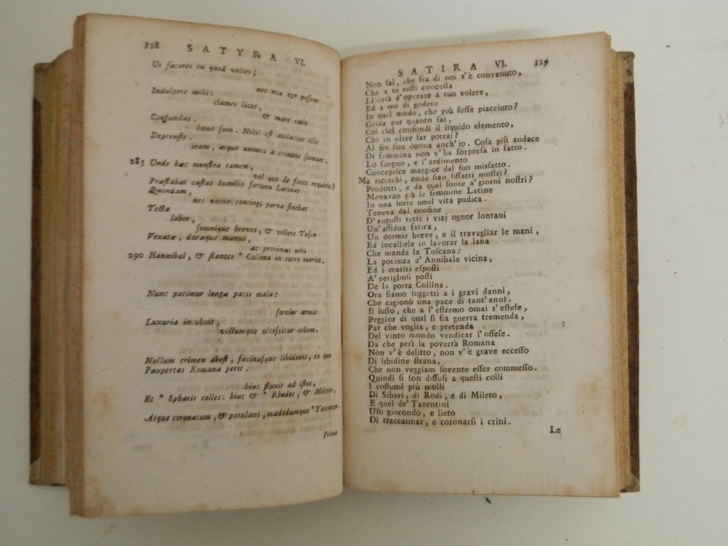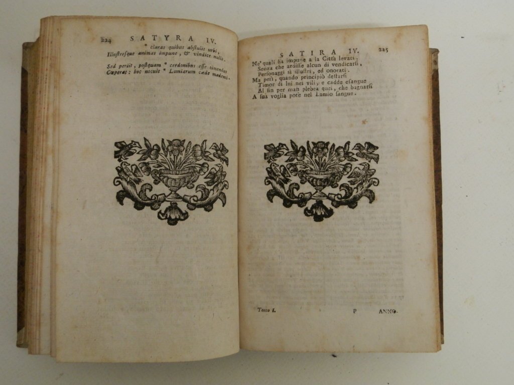 8^, mm 180x110, pp. 543; 301, 214, tre tomi legati in due volumi, mezza pelle marrone con doppio tassello al dorso, ottima conservazione, sbiadite le impressioni al dorso, una gora all'angolo superiore del primo tomo alle ultime carte. Ogni satira è riccamente annotata le annotazioni su testo a doppia colonna così come l'indice nel terzo tomo, illustrazioni xilografiche di cui alcune a piena pagina per lo più raffiguranti iscrizioni o antichi bassorilievi. Riedizione della celebrata stampa padovana, (1711). Gamba, 2276: "Piuttosto che traduzione piò reputarsi parafrasi accompagnata da lungo ed erudito Commentario".. *** TUTTI I NOSTRI LIBRI SONO VISIBILI PREVIO CONTATTO MAIL O TELEFONO NELLA NUOVA SEDE DI MILANO: LIBRERIA COSMOPOLIS, VIA JOMMELLI, 22. ***