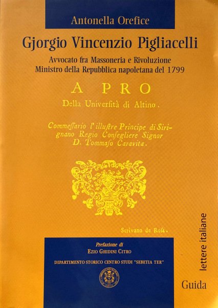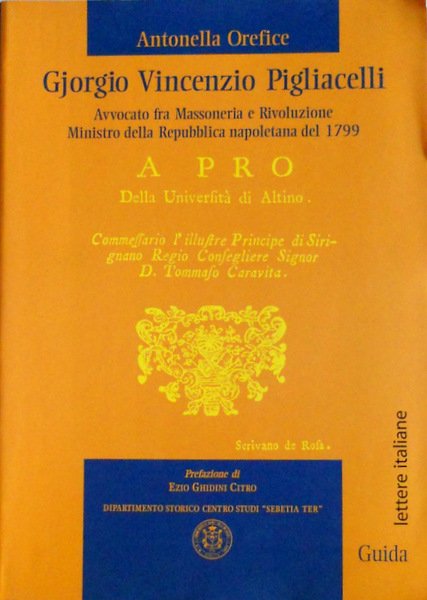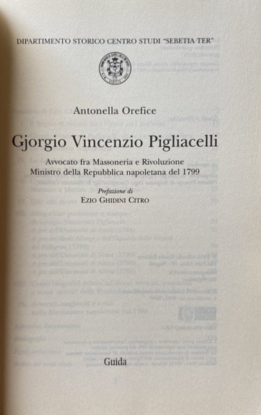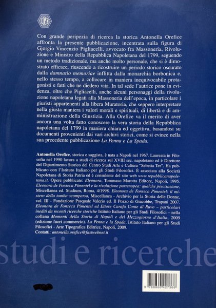 "Con grande peripezia di ricerca la storica Antonella Orefice affronta la presente pubblicazione, incentrata sulla figura di Gjorgio Vincenzio Pigliacelli, avvocato fra Massoneria, Rivoluzione e Ministro della Repubblica Napoletana del 1799, seguendo un metodo tradizionale, ma anche molto personale, che si è dimostrato efficace, riuscendo a ricostruire un periodo storico oscurato dalla damnatio memoriae inflitta dalla monarchia borbonica e, nello stesso tempo, a collocare in maniera inequivocabile protagonisti e fatti che ne diedero vita. In tal sede l'autrice pone in evidenza, oltre che Pigliacelli, anche alcuni personaggi della rivoluzione napoletana legati alla Massoneria dell'epoca, in particolare i giuristi appartenenti alla libera Muratoria, che seppero interpretare nella giusta maniera i valori morali e spirituali, di libertà e di amministrazione della Giustizia.