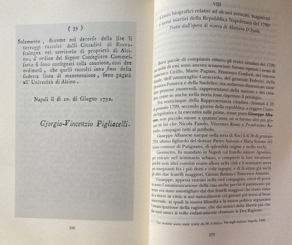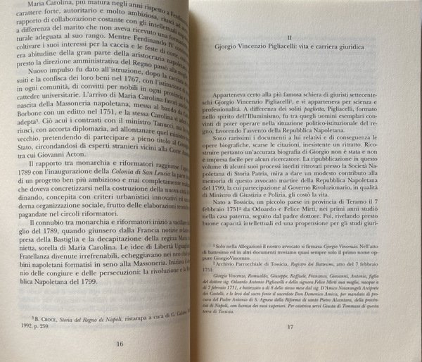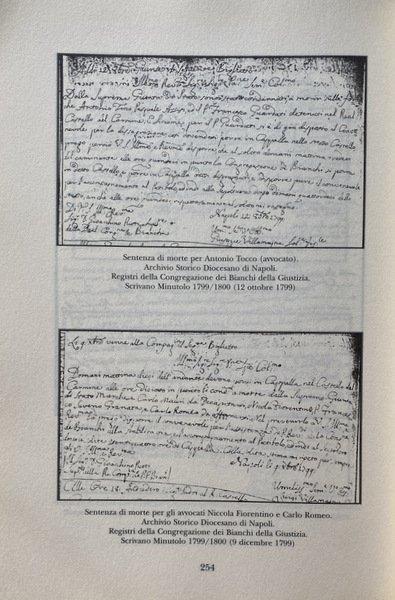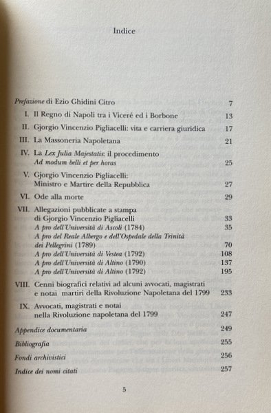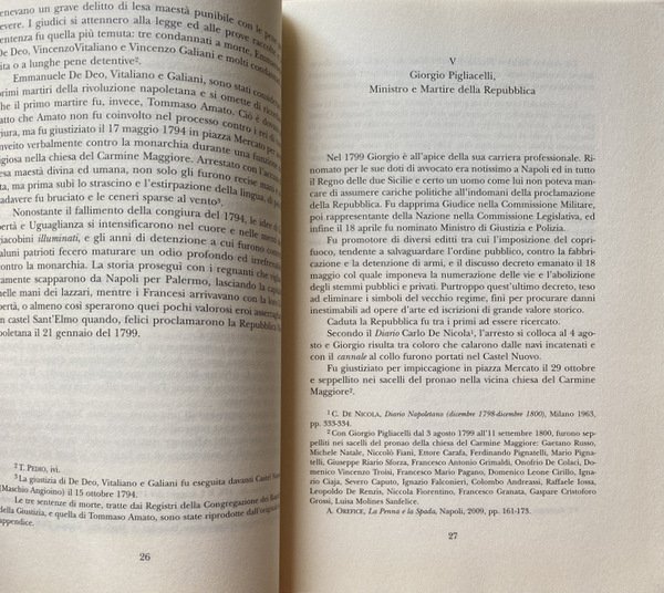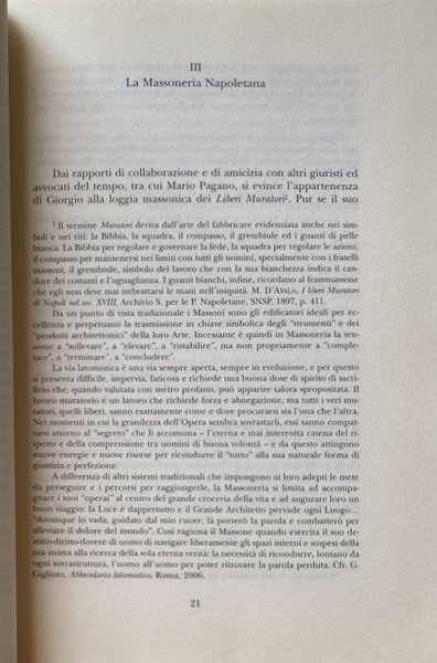 Soggetti: Biografie, Storia moderna, Rivoluzione Napoletana, Settecento, Rivoluzione francese, Illuminismo, Borghesia, Cultura, Massoneria, Martiri, Patrioti, Napoli, Legge, Governo, Intellettuali massoni napoletani, Memorie, Personaggi storici, politici e militari, Giuristi settecenteschi, Ministro di Giustizia e Polizia, Mario Pagano, Loggia massonica, Liberi Muratori, Borbone, Borboni, Regno borbonico, Carlo Lauberg, Emanuele De Deo, Vincenzo Galiani, Vincenzo Vitaliani, Tommaso Amato, Carlo De Nicola, impiccagione, piazza Mercato, Domenico Cirillo, Mario Pagano, Ignazio Ciaja, Eleonora De Fonseca Pimentel, Ettore Carafa Conte di Ruvo, Giuseppe Albanese, Nicola Fasulo, Prosdocimo Rotondo, Vincenzo Russo, Archivio storico, Bibliografia, Uomini illustri, Documenti, Riferimento, Bibliografia, Biografie, Logge massoniche, Michelangelo D'Ayala, Londra, Grande Oriente, Dichiarazione universale, Diritti dell'uomo, Caffè, Circoli culturali, Luigi Bozzaotra, Francesco Lomonaco, Rapporto Carnot, Cardinale Ruffo, Repressione, Libertà, Uguaglianza, Italia meridionale, Calabria, Puglia, Giuseppe Logoteta, Nicola Mazzola, Vincenzo Lupo, Gregorio Mattei, Bouvier Laffargue, Ferdinando, reggenza, Bernando Tanucci, Antonio Genovesi, Paglietta, Paglia, Allegazioni, Maria Carolina, Benedetto Croce, Fondo Notarile, Notai, Atti, Gran Maestro, Principe Sansevero Raimondo di Sangro, Luce massonica, Moncada, Alchimia, Esoterismo, Capece Minutolo, Resoconti, Reportage, Società patriottica, Libri rari Vintage fuori catalogo, Dottrina, Congiura, Difesa, Avvocatura, Avvocati, Medici, Processi, Accuse, Lesa maestà, Lex Julia Majestatis, Vicerè, Immobilismo, Spagnoli, Tortura, Inquisizione, Nunziatella, Riario Sforza, Piazza del Carmine, Esecuzioni, Silvia Pannuto, Reale Albergo dei Poveri, Università, Vestea, Altino, Ospedale della Trinità dei Pellegrini, Sentenze di morte, Commissione notarile, Registri notarili, Commissione, Sentenze di morte, Giambattista Vico, Luisa Sanfelice, Francia, Talleyrand, Championnet, Maria Antonietta, Domenico Bisceglia, Due Sicilie, Biographies, History, Neapolitan Revolution, Eighteenth Century, French Revolution, Enlightenment, Bourgeoisie, Culture, Freemasonry, Martyrs, Patriots, Naples, Law, Government, Neapolitan Freemason Intellectuals, Memoirs, Historical, Political Military Figures, Eighteenth Century Jurists, Minister of Justice and Police, Masonic Lodge, Freemasons, Bourbon, Bourbons, Bourbon Kingdom, Hanging, Historical Archives, Bibliography, Illustrious Men, Documents, Reference, Bibliography, Biographies, Masonic Lodges, London, Great Orient, Universal Declaration, Human Rights, Coffee, Cultural Circles, Cardinal, Repression, Liberty, Equality, Southern Italy, Regency, Allegations, Notaries, Deeds, Grand Master, Masonic Light, Alchemy, Esotericism, Reports, Patriotic Society, Out-of-print rare books, Doctrine, Conspiracy, Defence, Advocacy, Lawyers, Doctors, Trials, Accusations, Lese majeste, Viceroy, Immobilism, Spaniards, Torture, Inquisition, Executions, University, Hospital, Death sentences, Notarial commission, Notarial registers, Commission, Death sentences, France, Marie Antoinette, Two Sicilies