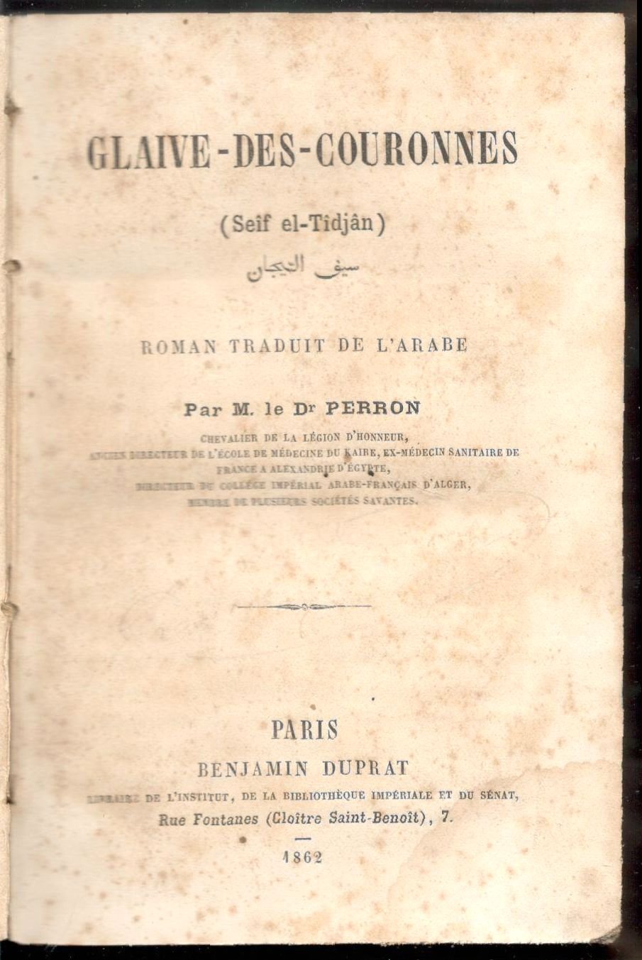 In 12°, pp. X, 334. Mezza tela dell'epoca. Dorso con titolo manoscritto su etichetta. Tagli decorati. Ingialliture e qualche alone. Romanzo storico arabo tradotto.