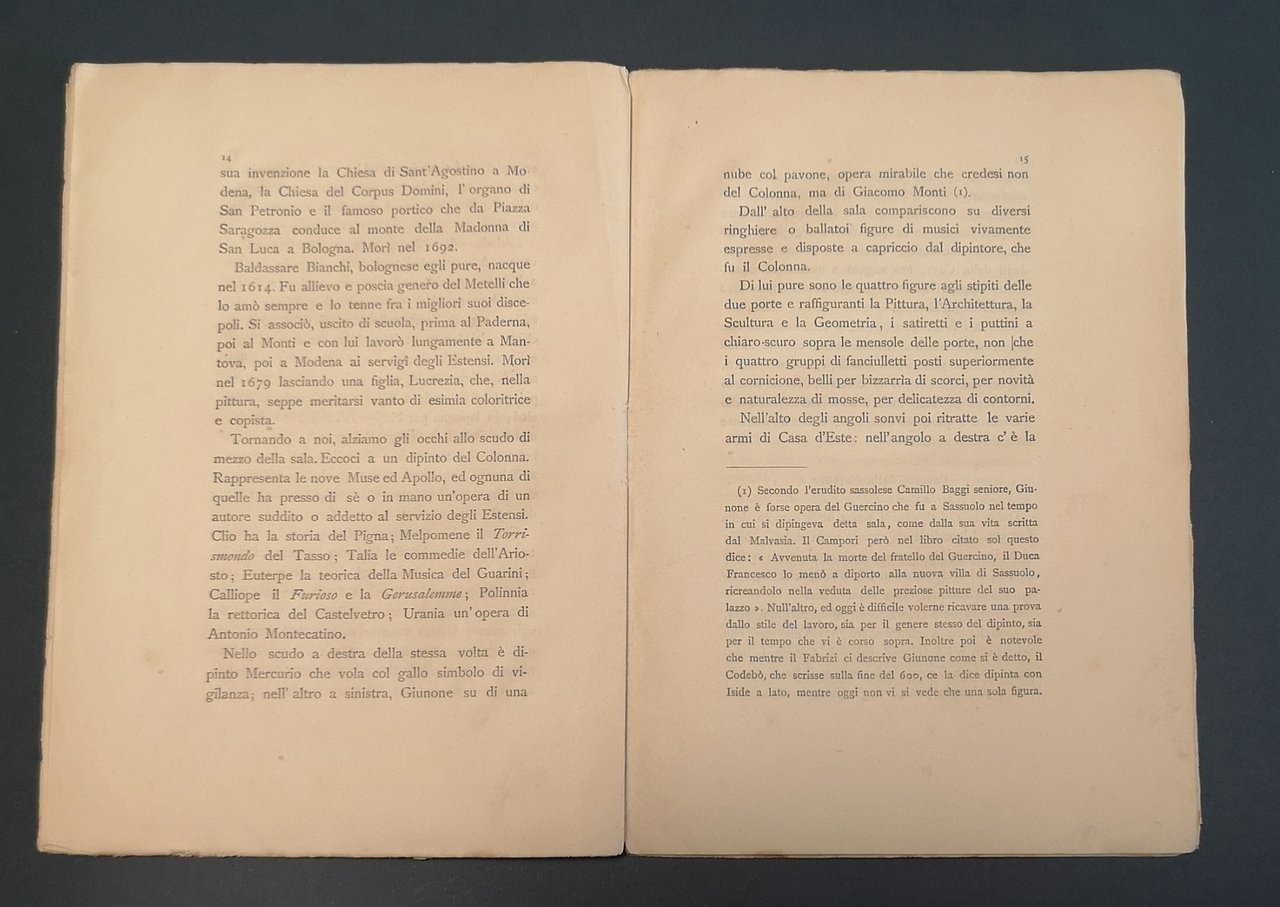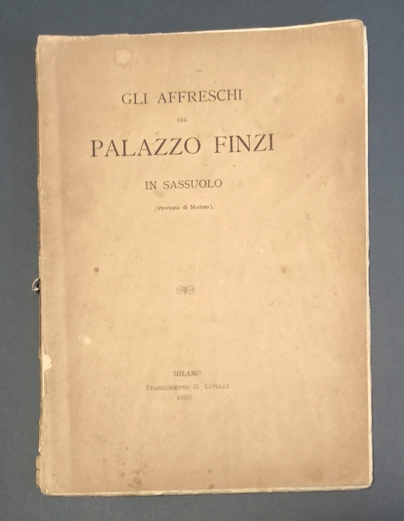 >in-8, pp. 63, (1) di indici. Broch. edit. Edizione originale, assai rara, il cui autore si desume dalla dedica, di questa guida artistica agli affreschi del Palazzo Ducale di Sassuolo, scritta qualche mese dopo la cessione della proprietà da parte del Conte d'Espagnac e dunque preziosa testimonianza artistica prima che il palazzo fosse destinato a vari usi. Il magnifico palazzo estivo per la villeggiatura della corte Estense, costruito da Avanzini inglobando il vecchio castello noto come Rocca, subì parecchie vicissitudini durante il XIX secolo. Durante l'occupazione napoleonica, fuggito il duca estense, il palazzo fu venduto al conte Carlo Amabile Demarzit Sahuguet d'Espagnac e subì diversi passaggi, negli ultimi anni dell'Ottocento finì anche ad essere utilizzato da un salumificio e il grande parco del palazzo divenne un'azienda agricola. Tra gli artisti autori degli splendidi affreschi si ricordano Mitelli, Colonna e Boulanger. Buon esemplare, fresco e a p. margini (pagine leggermente allentate).