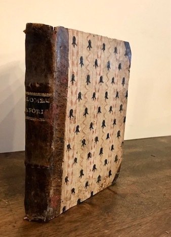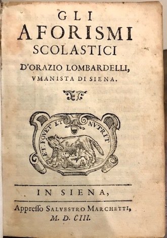 8vo (cm. 15,8), 16 cc.nn., 187(1) pp., 2 cc.nn. (di cui l’ultima bianca). Stemma xilografico della città di Siena al frontespizio, ripetuto sulla penultima carta. Alcuni capilettera e fregi n.t. Legatura coeva in mz. pelle con nervi e titolo oro su tassello al ds. (lievi tracce d’uso e piccoli difetti marginali). Mancanza alla carta di guardia libera anteriore ed una firma anticamente cassata al colophon. Qualche macchiolina e un trascurabile percorso di tarlo al margine interno di poche carte. Nel complesso, esemplare in buono stato di conservazione. Prima rara edizione. Opera che raccoglie l’esperienza didattica del Lombardelli - sia svolta nel seminario vescovile di Siena che privatamente e che contiene ben 887 massime. Br. Libr., p. 499. Non in Vinciana né in Gamba.