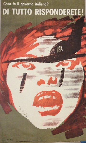 Manifesto a colori (cm. 100 x 58), titoli in bianco e nero su fondo verde. Al centro un disegno che raffigura un grande volto e un aereo americano mentre sgancia delle bombe. Ben conservato.