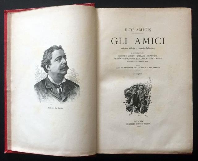 Edizione ridotta e riveduta dall'Autore e illustrata da Gennaro, Amato, Gaetano, Colantoni, Isidoro Farina, dante Paolocci, Ettore Ximenes, Giuseppe Penasilico. Dono del Corriere della Sera ai Suoi Abbonati. Milano, Fratelli Treves Editori, 1889 - 2° migliaio. La prima edizione è sempre Treves ma 1883. In 8vo, pp. 308 + 1 (Indice) + 2 editoriali, ritratto dell'autore inciso su acciaio in antiporta, front. con vignetta incisa, vignette incise e illustrate in b/n a mo' di testatine, all'interno del testo e come finalini a ogni capitolo (tutte le illustrazioni sono tratte dai disegni degli autori citati), contropiatti e fogli di guardia in carta marrone, leg. orig. in tutta percallina rossa con titolo oro al dorso. Un aloncino di umido al margine inferiore e agli angoli in basso, un fisiologico ma lieve e uniforme ingiallimento delle pagine con minuti puntini di invecchiamento, nell'insieme molto buono lo stato di conservazione di tutto il volume.