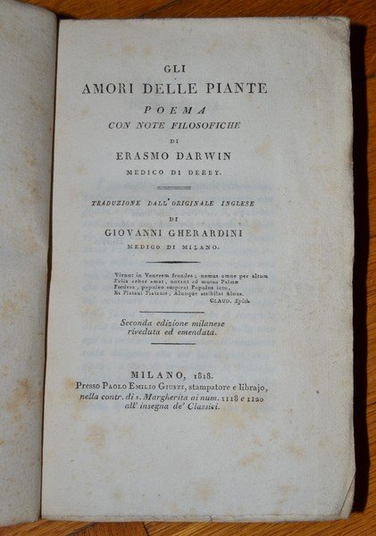 *Gli amori delle piante. Poema con note filosofiche di Erasmo Darwin medico di Derby. Seconda edizione milanese riveduta ed emendata. 1818