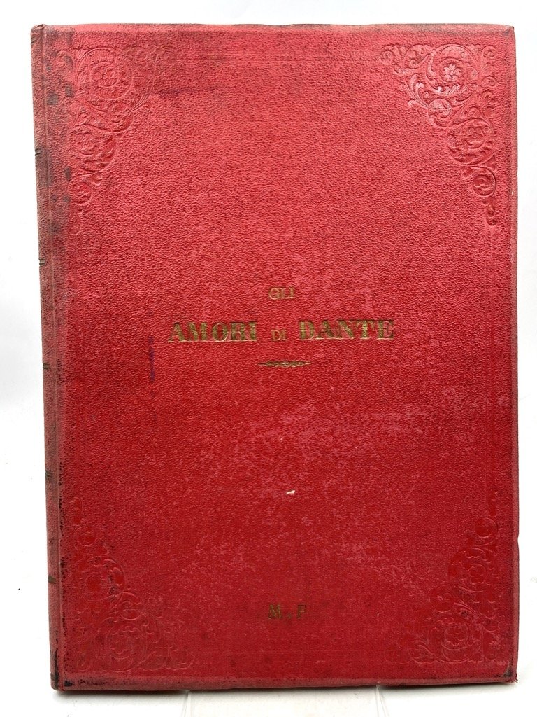 Legatura in tela rossa con fregi a secco e titoli dorati (difetti), cm 36 x 25, pp VIII 190 con alcune tavole in nero. Edizione popolare con una scelta di versi d’amore di Dante (e alcuni di dubbia attribuzione) corredati dal commento di Giacinto Stiavelli e illustrati da alcune tavole di Alessandro Pigna (1862-1919).