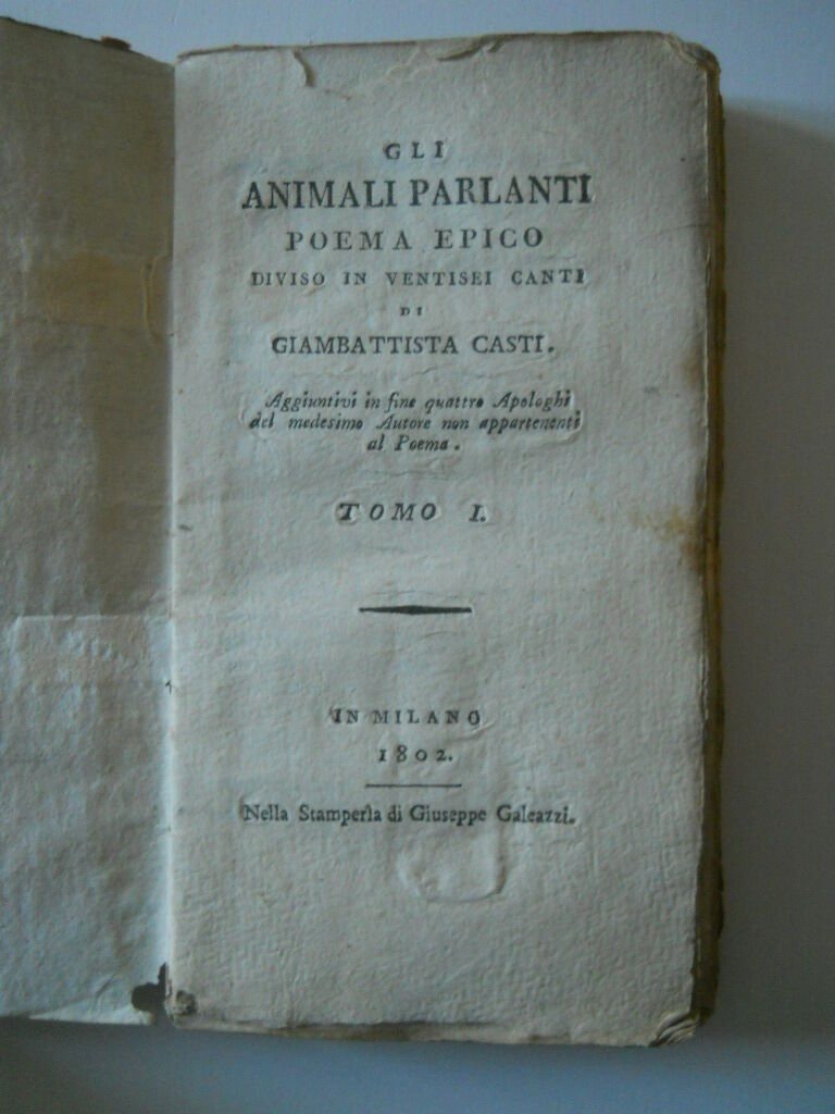 GLI ANIMALI PARLANTI POEMA EPICO DIVISO IN VENTISEI CANTI DI GIAMBATTISTA CASTIAGGIUNTIVI IN FINE QUATTRO APOLOGHI DEL MEDESIMO AUTORE NON APPARTENENTI AL POEMA.IN MILANO 1802 NELLA STAMPERIA DI GIUSEPPE GALEAZZI.Cm. 10,5 x 17, 3 volumi, pag. XI 194 (2) - 250 - (1) 210, legatura coeva, copertina in cartoncino con tassello applicato sul dorso, pagine con ampio margine in barbe.In ottime condizioni, lievi segni ai dorsi e piccolissime pieghe agli angoli delle pagine.