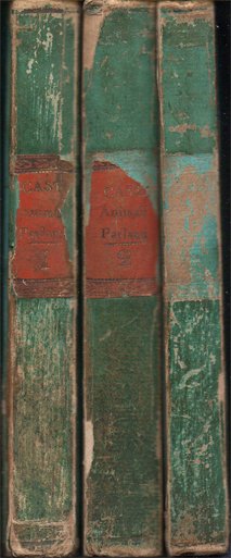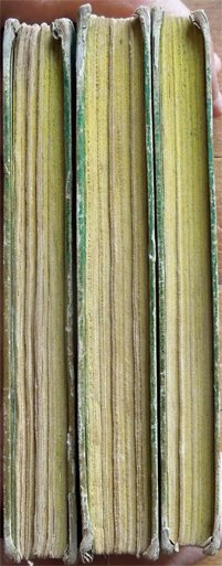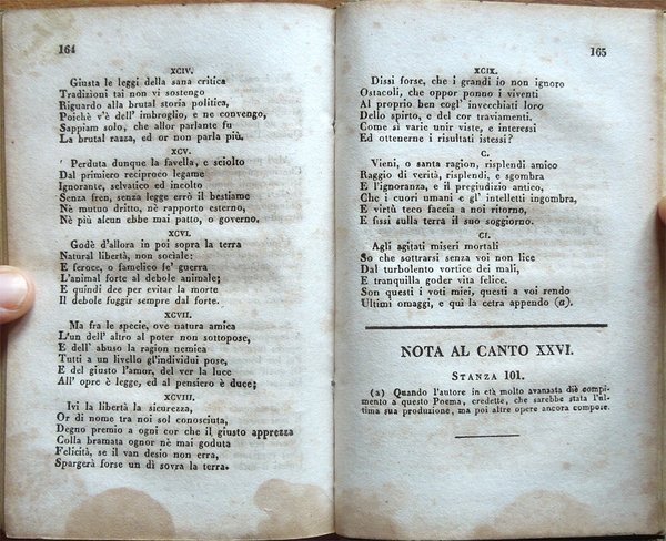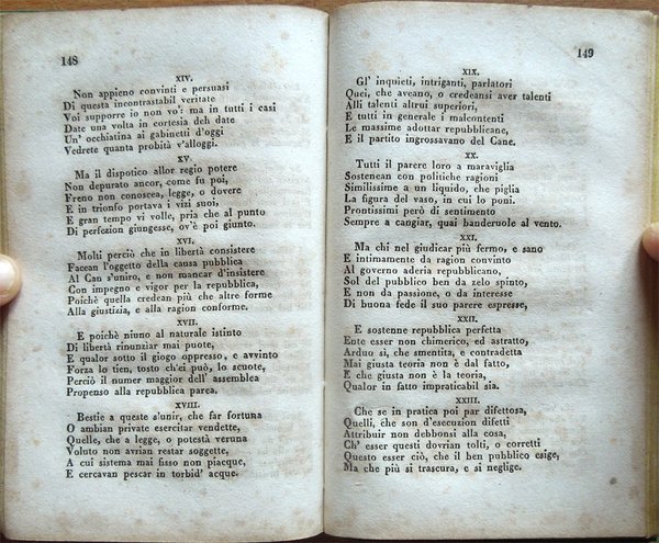 Tre volumi in-24° (13,8 x 8,2 cm), pp. X, 231, (1); (2), 252; (2), 188, legatura coeva in cartone ricoperto di carta verde, con titoli su tassello in carta al dorso. Segni d'uso e del tempo alla legatura, in particolare, piccole mancanze di carta, qualche leggera abrasione, alcuni aloni; il tassello con i titoli ai volumi primo e secondo presenta alcune mancanze, è completamente mancante al volume terzo. Tagli gialli. Leggere, diffuse fioriture. Per il resto, in buono stato.