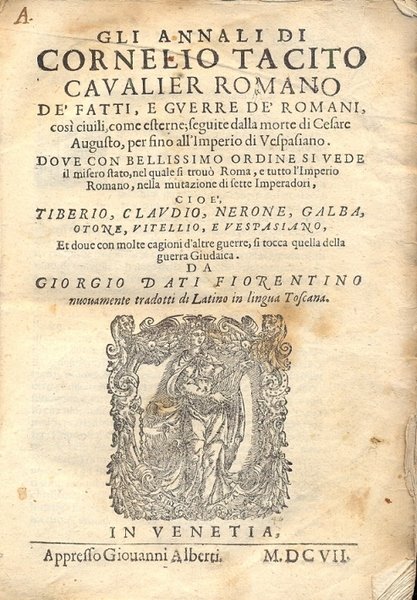 Gli annali de' fatti e guerre de' romani così civili, come esterne; seguite dalla morte di Cesare Augusto, per sino all'Imperio di Vespasiano. Dove con bellissimo ordine si vede il misero stato, nel quale si trovò Roma, e tutto l'Impero Romano, nella mutazione di sette Imperatori, cioè Tiberio, Claudio, Nerone, Galba, Otone, Vitellio e Vespaziano, et dove con molte cagioni d'altre guerre si tocca quella della guerra Giudaica. Da Giorgio Dati Fiorentino nuovamente tradotti di Latino in lingua Toscana.