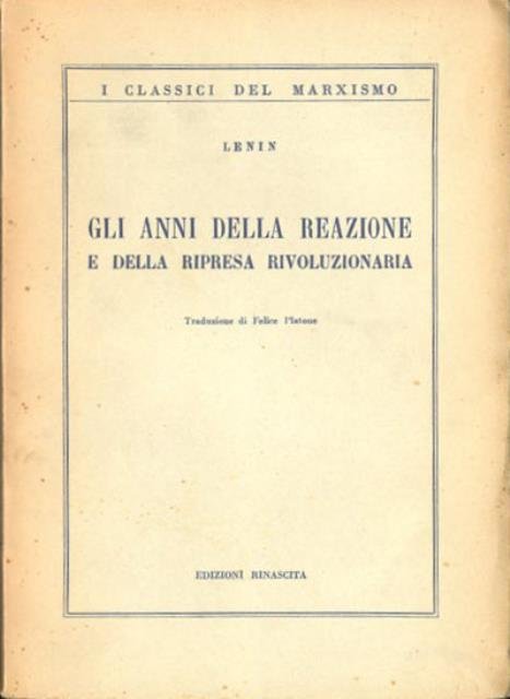 345 p. ; 22 x 16 cm. I classici del marxismo. Traduzione di Felice Platone. Il presente volume contiene una larga raccolta di scritti di Lenin che si riferiscono al periodo seguente la prima rivoluzione russa (1905) fino alla vigilia della guerra imperialista. Brossura editoriale con bandelle. Leggero ingiallimento della carta interna e della copertina. Codice libreria 674.