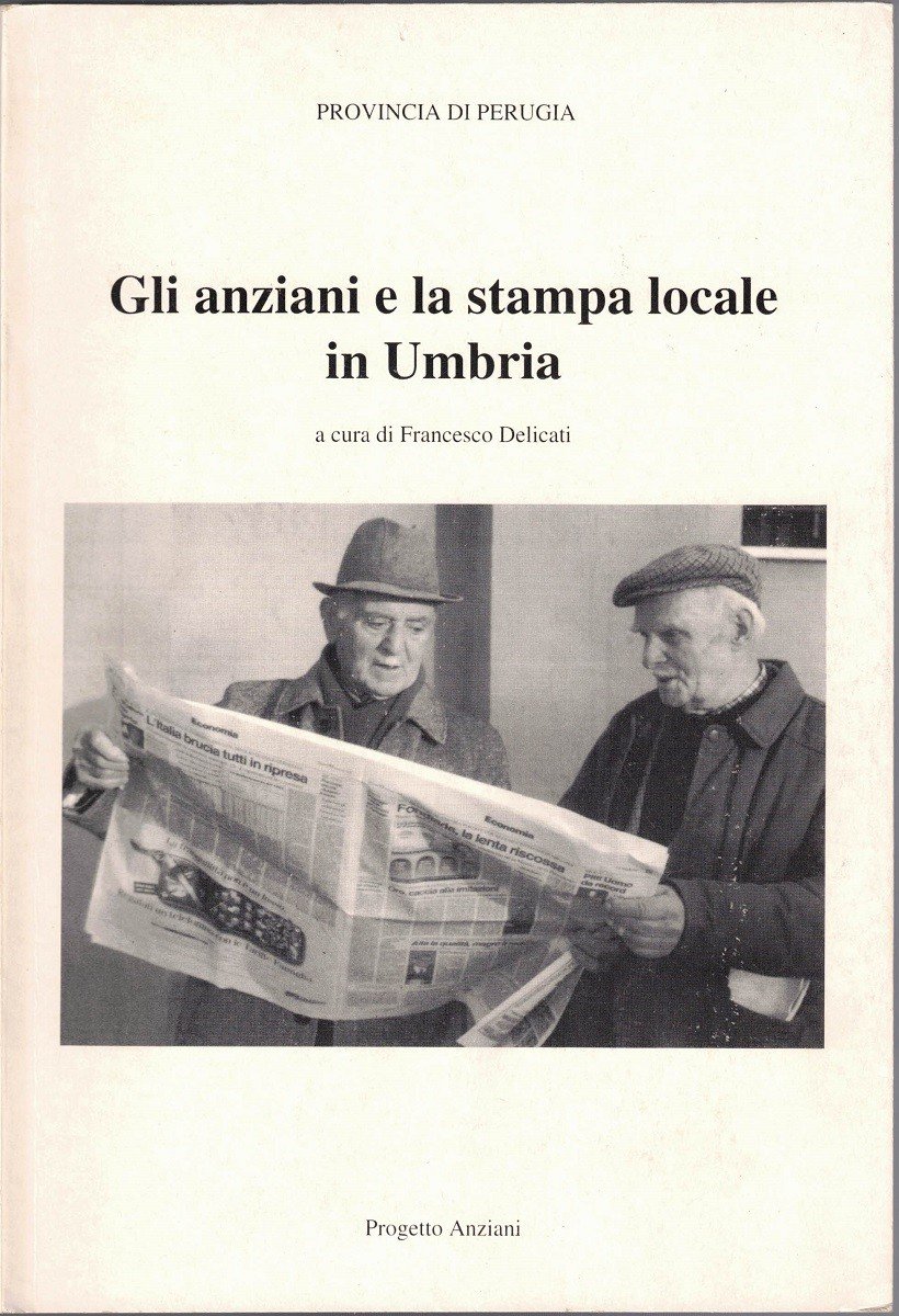 Gli anziani e la stampa locale in Umbria, a cura di Francesco Delicati, Progetto Anziani, Perugia 1995, pp. 204, ill. b.n., cm 24, br. ed. In testa al frontespizio: Provincia di Perugia – Settore Attività Culturali Sociali e Sportive – Servizio Ricerca Documentazione e Promozione Sociale. Indice: Katia Belillo, Presentazione – Paolo Montesperelli, Introduzione – Francesco Delicati, Gli anziani e la stampa locale in Umbria (Il metodo adottato – Le tendenze generali – Le caratteristiche morfologiche – L’informazione firmata e il giornalismo locale – L’analisi dei temi in generale – Cronaca nera/devianza/disagio – Servizi socio-assistenziali – Cultura – Interventi politico-istituzionali – Cronaca – Sanità – La rappresentazione giornalistica della anzianità) – Appendice A: Note integrative (Stefania Gatti, Riflessioni per la realizzazione di interventi a favore degli anziani – Luigi Tittarelli, La presenza dei vecchi nella popolazione, la loro immagine e i loro bisogni – Paolo Mancini, Gli anziani. Oggetti o soggetti dell’informazione giornalistica? – Bruno Brunori, Anziani e informazione – Domenica A. Gristina, Alcune riflessioni sui servizi per gli anziani e gli operatori – Nella Borri, L’ascolto dell’anziano) – Appendice B: Strumenti di rilevazione – Bibliografia. All’interno del volume, conservato foglio a stampa sciolto contenente gli errata corrige. Minime tracce d’uso, lievissima ingiallitura ai margini delle carte, per il resto perfetto.
