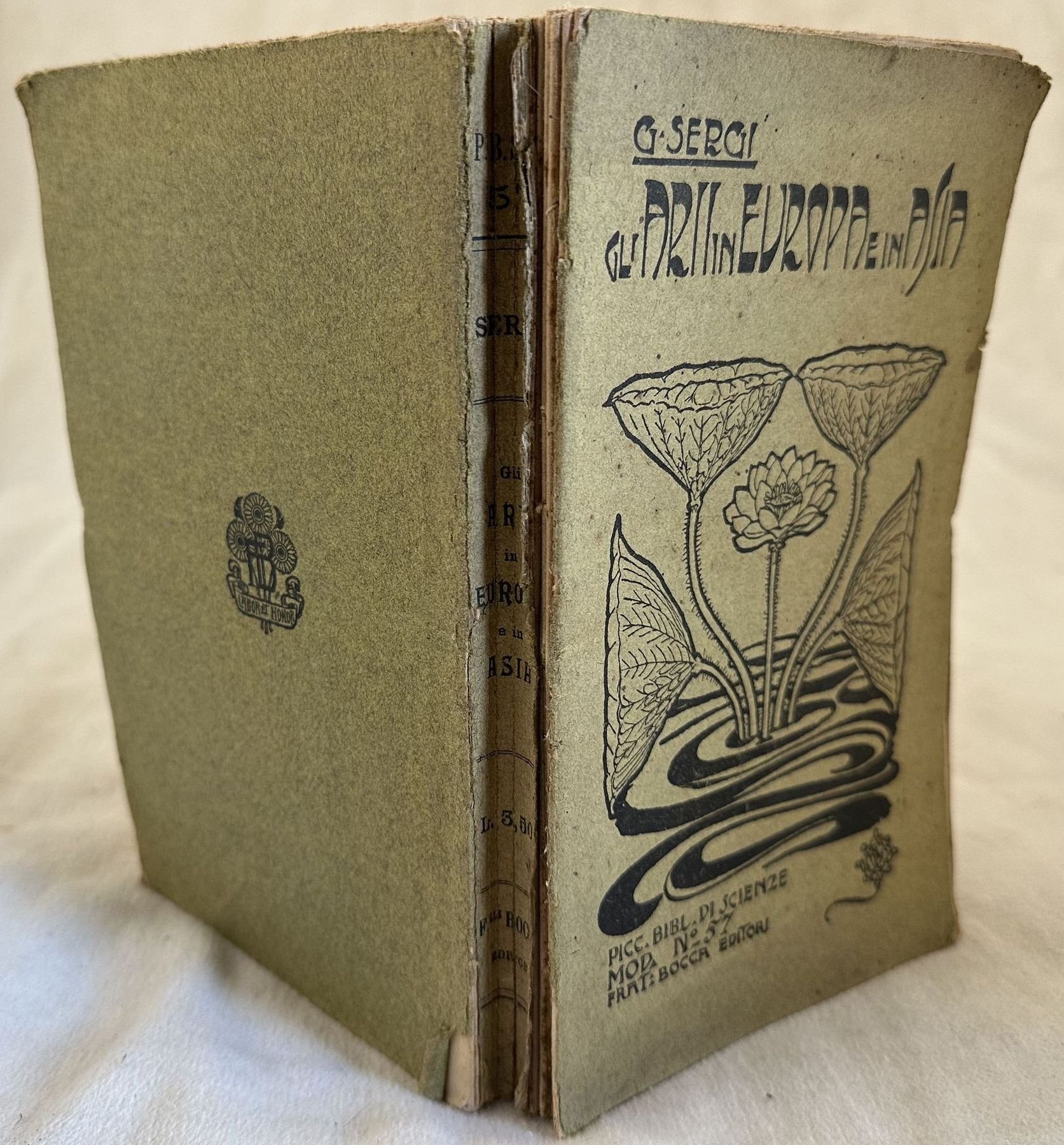 Edizione del 1903 di questo studio etnografico sugli arii in Europa e in Asia di Sergii. Numerose foto e qualche mappa ripiegata. All'interno: Arii in Europa, Arii in Asia, Arii d'Europa e Asia, Le lingue degli Arii, La coltura degli Arii primitivi, Le origini della cultura aria in Asia, La leggenda dell'origine asiatica dei popoli ecc. Dedica con firma autografa dell'autore all'occhietto. In buone condizioni. Copertina editoriale in buone condizioni con lievi usure ai margini e dorso. Legatura in discrete condizioni con rotture. All'interno le pagine si presentano in ottime condizioni con rare fioriture. In 8. Dim. 20,5x12,5 cm. Pp. VIII+(4)+272.Edition of 1903 of this ethnographic study about aryans in Europe and Asia by Sergii.<BR><BR>Different photos and folded map. Inside: Aryans in Asia, Aryans of Europe and Asia,Language of Aryans, Culture of primite aryans, Origin of culture in Asia, Legend of asiatic origin of people ecc. In good conditions. Editorial cover in good conditions lightly worn in the extremities. Binding in fair conditions with cracks. Pages in very good conditions with occasional foxings. In 8. Dim. 20,5x12,5 cm. Pp. VIII+(4)+272.
