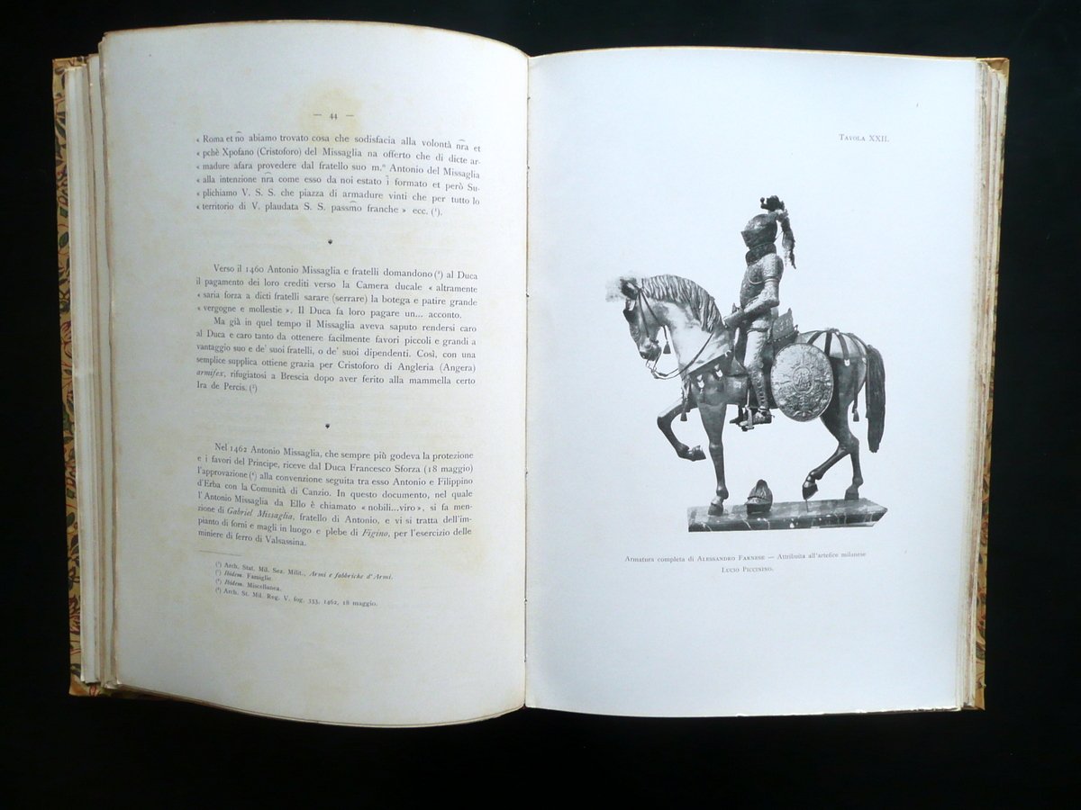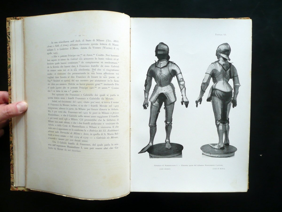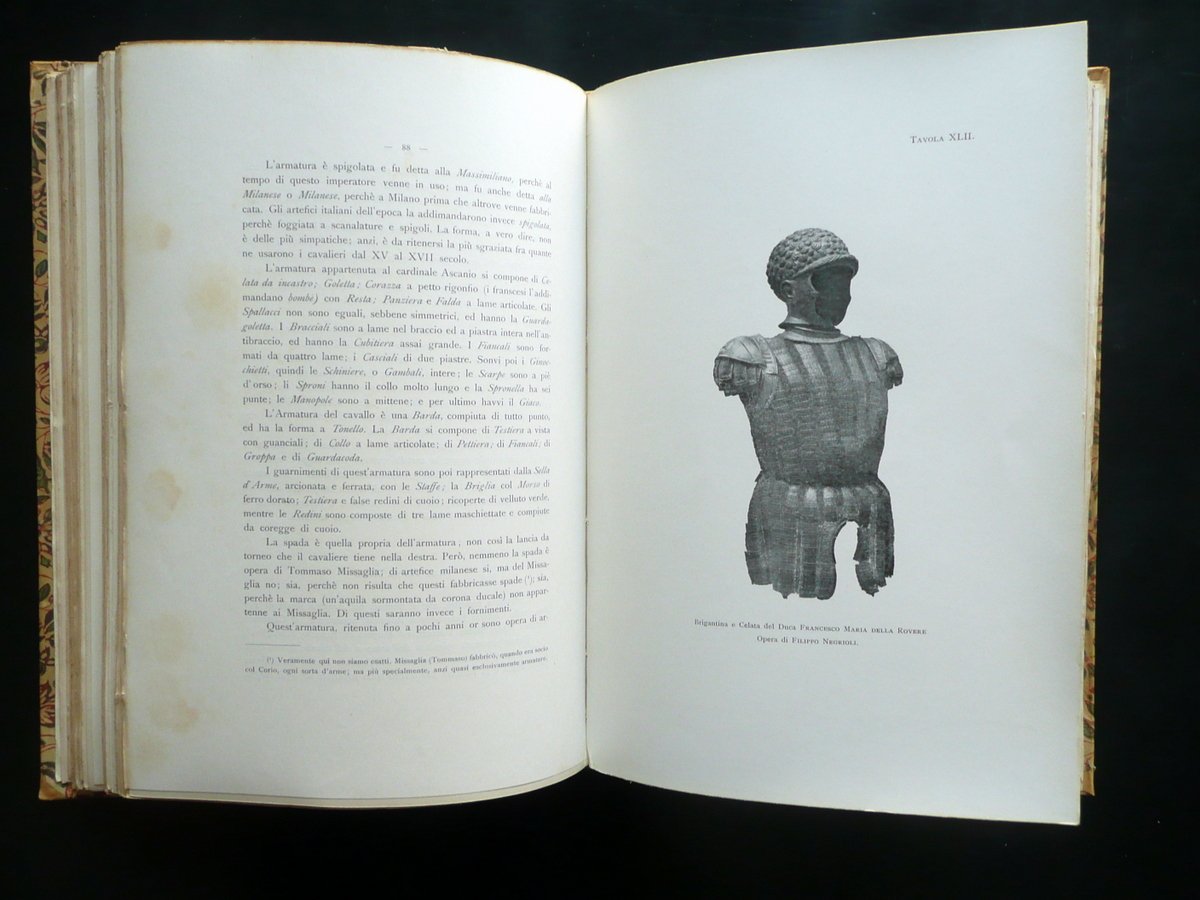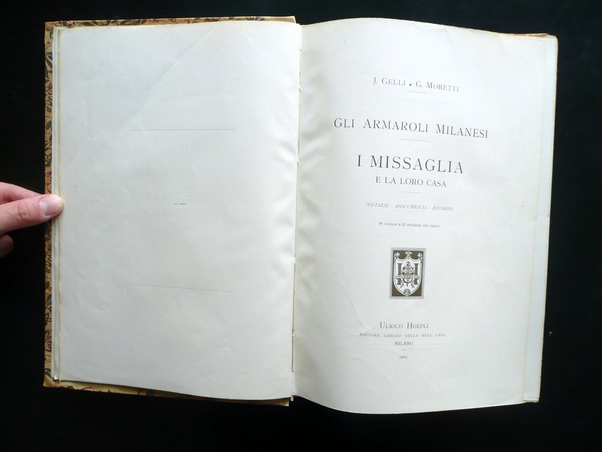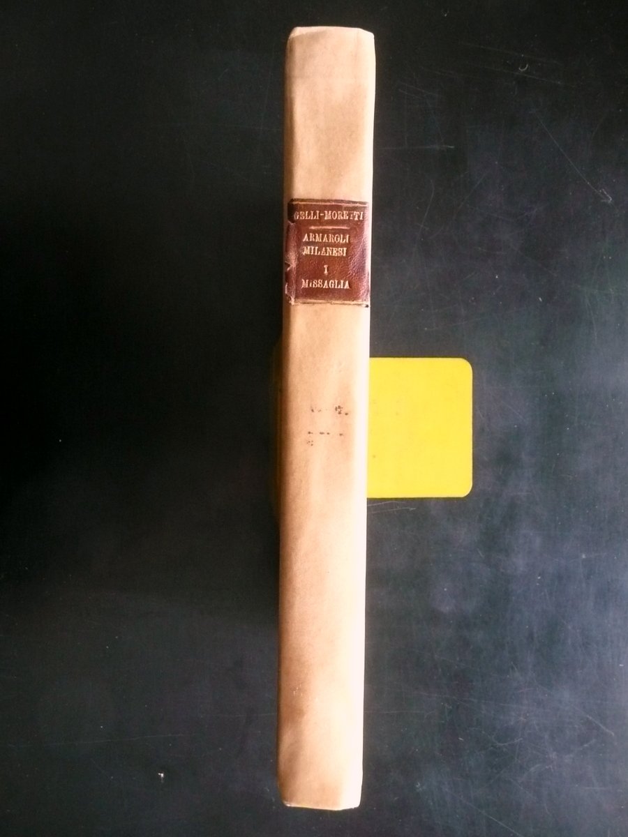 J. Gelli - G. Moretti, Gli Armaroli Milanesi I Missaglia e la loro casa notizie - documenti - ricordi 56 tavole e 12 incisioni nel testo Hoepli, Milano 1903; cm 31,5x22; pp. XVI-118 pi√π 56 tavole in b/n fuori t. e con 12 fig. in b/n nel t.; legatura d'epoca in mezza pergamena con titolo impresso in oro al dorso; piatti con decorazioni floreali a colori. Acclusa la brossura ant. originale a colori. Condizioni di conservazione Esemplare ben conservato con tracce d'uso; coperta con qualche piccolo leggerissimo alone e poche minuscole macchiette al dorso. Interni buoni con qualche piccola leggerissima brunitura e alone. Dettagliatissima pubblicazione sugli armaroli milanesi Missaglia, corredata da bell'apparato iconografico in bianco e nero. SETT153.L14693 N