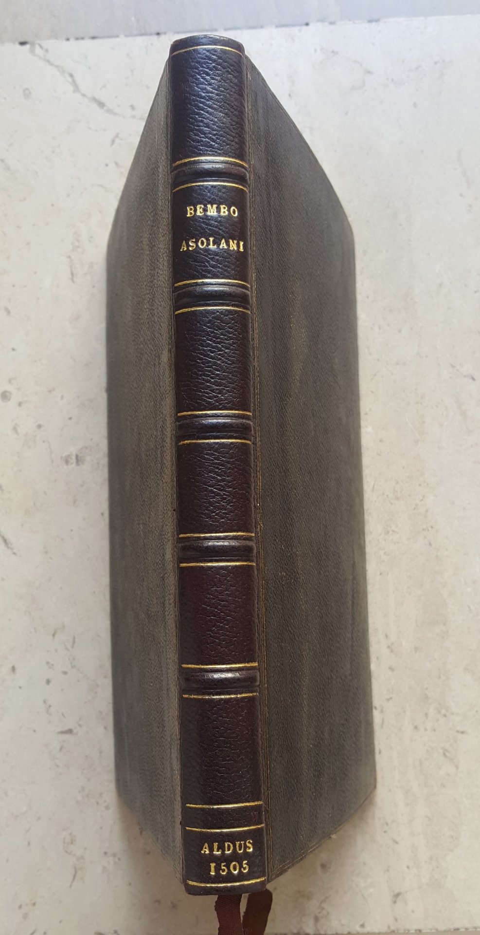>in-4 picc., ff. 98 n.n. (ultimo bianco presente), caratt. corsivo di Fr. Grifo. Lettera di dedica a Lucrezia Borgia al verso del primo e al recto del secondo foglio, impresa dell'ancora al verso del f.96, 1 f. di Errata, 1 f.bianco. Elegante legatura 800esca in p. pelle marrone zigrinata, titolo e filetti oro al dorso, tagli dor., dent. int. Prima edizione del noto romanzo del Bembo, ambientato ad Asolo ove alla corte di Caterina Cornaro regina di Cipro si festeggia lo sposalizio di una dama: in tre giornate alcuni gentiluomini veneziani parlano con delicatezza e vivacità di amore con altrettante gentildonne. Il Bembo iniziò a comporre Gli Asolani nel 1500, per amore di Maria Savorgnan, ma li concluse nel 1504, con una dedica, datata 1 Agosto, a Lucrezia Borgia, (''corrisposto, il più ambizioso e memorabile, ma rischioso anche e struggente amore della sua vita'' lo definì il Dionisotti). Questo bell'esemplare, completo dell'Errata spesso mancante, comprende, al verso del tit. ed al recto del secondo foglio, la lettera a Lucrezia. ''Non è chiaro perché di questa edizione si abbiano esemplari contenenti la dedicatoria a Lucrezia, nel frattempo diventata duchessa di Ferrara, e altri senza; ma è probabile che la duplicità non fosse estranea alle incertezze e difficoltà di un amore impossibile, che nella lontananza, da una parte e dall'altra, lentamente ma inevitabilmente si spegneva'' (ancora Dionisotti). Il Renouard attribuisce invece a ragioni politiche questo ripensamento, sottolineando che quasi sempre il f. bianco veniva tagliato, così come l'errata. Cecil H.Clough, in ''P.Bembo's Gli Asolani of 1505'' ritiene che la dedica sia stata deliberatamente antedatata, e che fosse in realtà stata scritta poco prima del Marzo 1505: Aldo avrebbe riservato 3 pagine bianche in attesa dell'approvazione di Lucrezia, stampando comunque alcune copie del quaderno a; non volendo rischiare di ripassarle al torchio, licenziò circa un terzo degli esemplari con le pag. bianche (cfr. Fletcher, New Aldine Studies, p. 185: ''Clough contends that the dedicatory was deliberately antedated by Bembo... that Aldus held three pages blank... that Aldus dared not risk spoiling the quantity of sheets already printed by putting them through the press once more to add the letter, and thus issued a quantity (one third of the pressrun?) with the blanks''). Questo bell'esemplare è ottimo, assai marginoso (mm.195x130), completo dell'Errata spesso mancante. (Iprimi due fogli furono all'epoca della nuova legatura rimarginati, in modo quasi impercettibile, e per rendere il volume uniforme tutte le pagine sono state reglées con un filetto di inchiostro rosso.). Renouard 48.1: ''Première édition assez rare''. UCLA 72. Scapecchi, A.M., i suoi libri, i suoi amici, n. 33. Laurenziana 90. Gamba 132. Razzlini-Bacchi p.48.