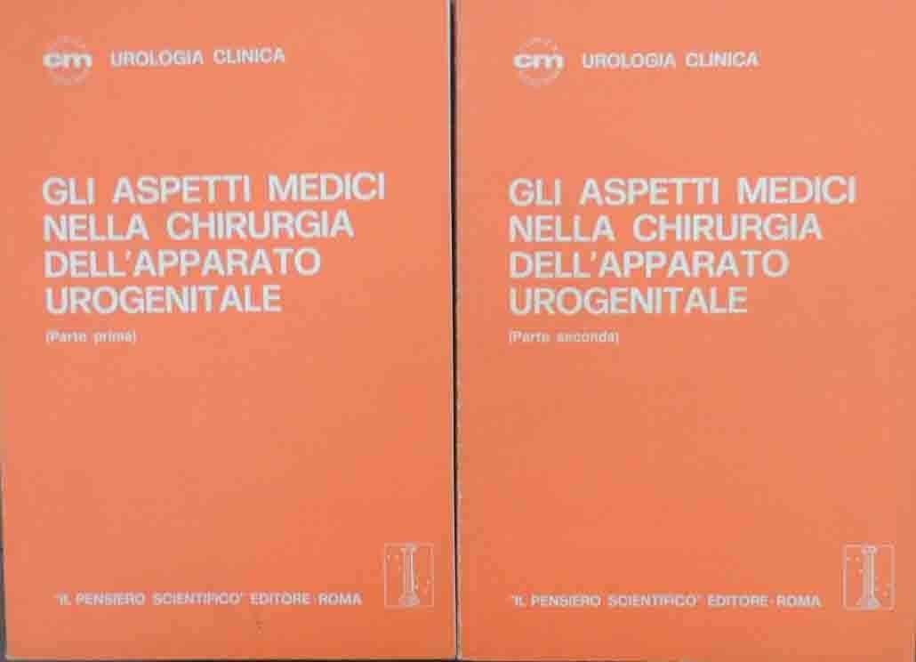 Gli aspetti medici nella chirurgia dell’apparato urogenitale, a cura di Leslie Dornfeld e Lester A. Klein, edizione italiana a cura diFabio Corsi e Giovanni Creton, Il Pensiero Scientifico Editore, Roma 1977, prima ed. italiana, 2 voll., pp. 386, ill. b.n., cm 21, br. ed. Collana Clinica Moderna. Serie Urologia Clinica, vol. II, nn. 2-3, agosto-dicembre 1977. Titolo originale: The urologic clinics of North America. Medical aspects of genitourinari surgery. Leggere tracce d’uso alla brossura, una piccola abrasione alla seconda di copertina del secondo volume, qualche carta con lievi sottolineature a biro, per il resto ben conservati.