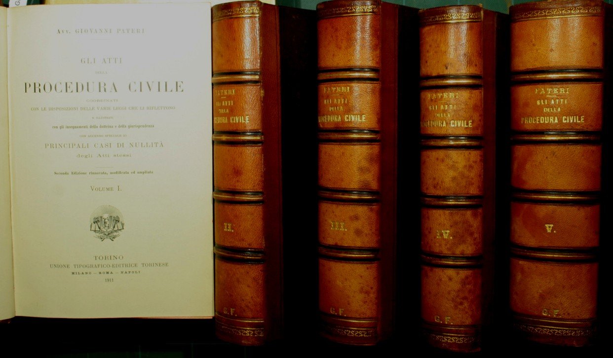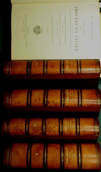 Coordinati con le disposizioni delle varie leggi che li riflettono e illustrati con gli insegnamenti della dottrina e della giurisprudenza con accenno speciale ai principali casi di nullità degli atti stessi - Seconda edizione rinnovata, modificata ed ampliata - in 8° - pp.674; 750; 806; 715; 958 - Mezza pelle con titolo e fregi in oro al dorso nervato - Cinque volumi - Tagli rossi