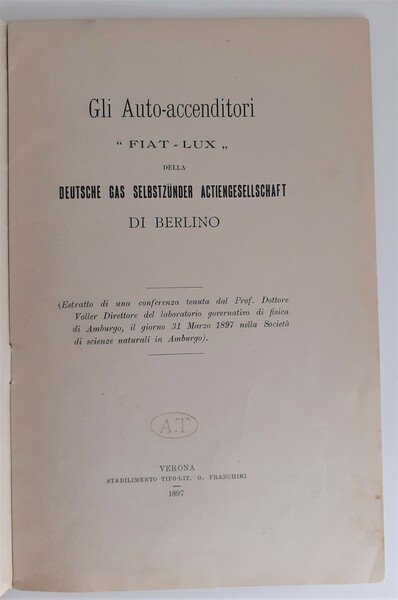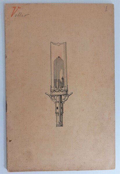 In 4°; (2), 13, (1) pp. Brossura editoriale illustrata con immagine di un Auto-Accenditore. Antico timbretto ex-libris privato al frontespizio. Una tavola nel testo. "Estratto da una conferenza tenuta dal Prof. Dottore Voller Direttore del laboratorio governativo di fisica di Amburgo, il giorno 31 Marzo del 1897 nella Società di scienze naturali in Amburgo". Prima edizione di questa interessante monografia dedicata ad un tipo di accenditore elettrico per lampade a gas per l'illuminazione pubblica. Due tavole, una a piena pagina nel testo con immagine del congegno.