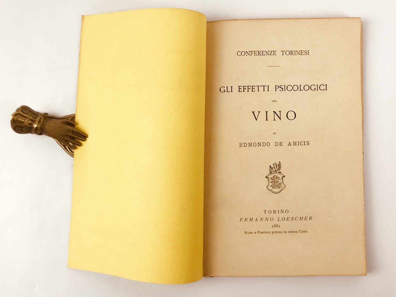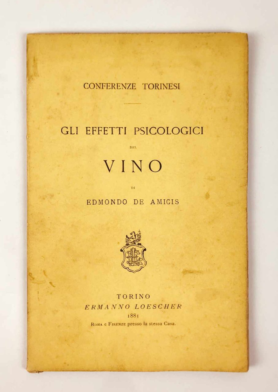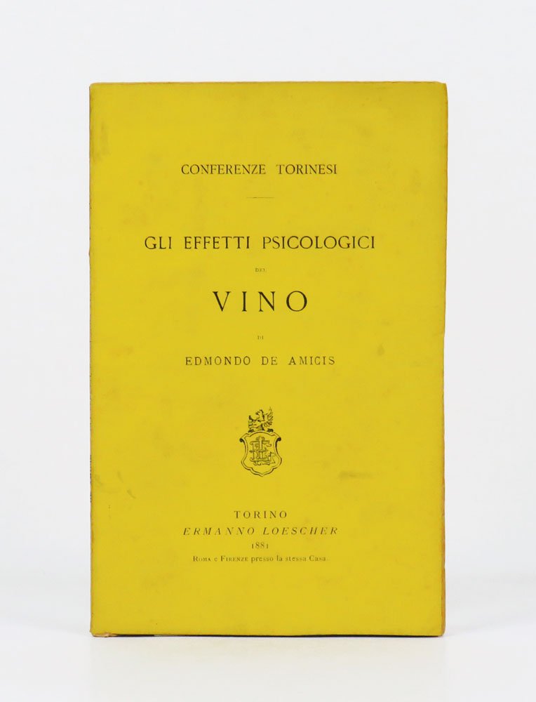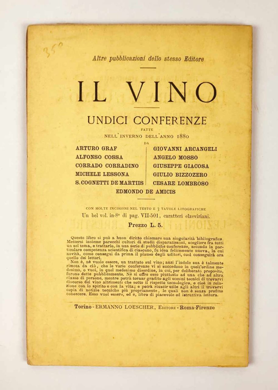 LIBROEdizione originale.Ottimo esemplare, freschissimo e pulito, intatto in ogni sua parte compresa la copertina originale in brossura.Rarissimo opuscolo stampato a seguito delle «Undici conferenze fatte nell’inverno dell’anno 1880» sul tema del vino da Edmondo De Amicis, Arturo Graf, Michele Lessona, Giuseppe Giacosa, Cesare Lombroso e altri, in Torino. Appena menzionato da Marino Parenti nella sua lunga scheda dedicata alla seconda edizione illustrata procurata da Treves nel 1990, oggi molto comune (Rarità bibliografiche dell’Ottocento, pp. 314-319).