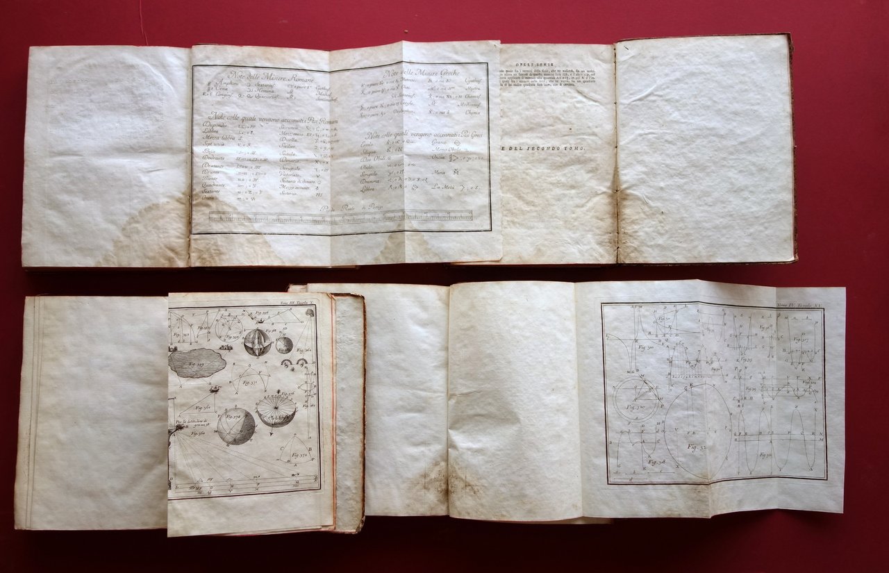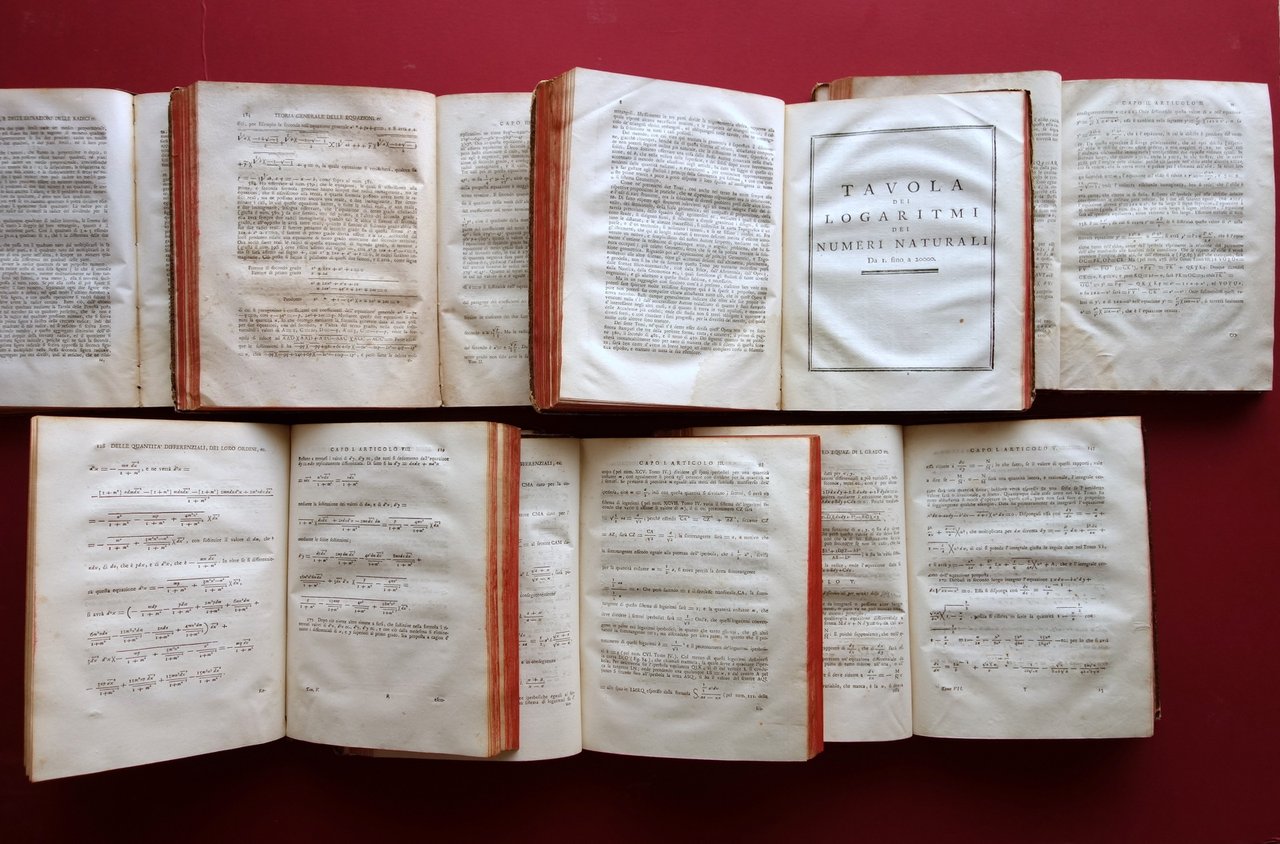 Settecentina, † Gli elementi teorico - pratici delle matematiche pure del padre Odoardo Gherli domenicano professore di Teologia Dogmatica nell'Universit‡ di Modena resi pubblici da Domenico Pollera tomi I - VII - opera completa in sette tomi Nella Stamperia di Giovanni Montanari - Presso la Soc. Tipografica, Modena 1770-1777; cm 27,5x20,5; pp. XXIV-358, pi˘ 1 tavv. in b/n rip. al termine del testo (tomo I); pp. XIV-448, con 5 tavv. in b/n rip. fuori t. (tomo II); pp. XII-312-114 (tavole dei logaritmi, dei seni, dei coseni), pi˘ 10 tavv. in b/n rip. al termine del testo (tomo III); pp. XII-404 pi˘ 15 tavv. inc. in b/n rip. al termine del testo (vol. IV); pp. [8]-380†pi˘ 4 tavv. inc. in b/n rip. al termine del testo (vol. V); pp. VIII-392†pi˘ 4 tavv. inc. in b/n rip. al termine del testo (vol. VI); pp. XL-440,†pi˘ 3 tavv. inc. in b/n rip. al termine del testo (vol. VII);†pregevole legatura d'epoca in mezza pelle con itolo e fregi floreali impressi in oro al dorso (titolo e numerazione del tomo entro tassello), piatti marmorizzati, tagli rossi. Opera completa in 7 tomi, molto rara. † Condizioni di conservazione Tomi tutti complessivamente ben conservati con tracce d'uso e leggeri segni del tempo; coperte con alcune leggere abrasioni e mancanze per lo pi˘ marginali; dorsi con pochi minuscoli forellini (vecchi danni da insetto); dorso del tomo I e cuffie dei tomi II, III e VI con piccole mancanze. Interni buoni con leggero foxing; alcune pagine con leggera / lieve ombra di gora, le quali non compromettono la lettura del testo. Per maggiori dettagli vedi foto. † Opera matematica molto rara, completa in 7 tomi. † SETT132.L22391 N