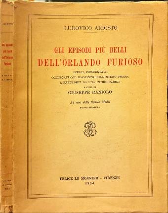 Scelti, commentati, collegati col racconnto dell'intero poema e preceduti da una introduzione di Giuseppe Raniolo. Ad uso delle Scuole Medie. Nuova tiratura. In 8° (cm 20,8 x 15,3), pp. [XXVII] + 214. Bross. tit. rosso al dorso avorio brunito. Segni di consunzione, strappetti ai margii e alle cuffie. Piccola mancanza al piede. Tagli e pp. bruniti. Tracce di polvere. Conndizioni molto buone.