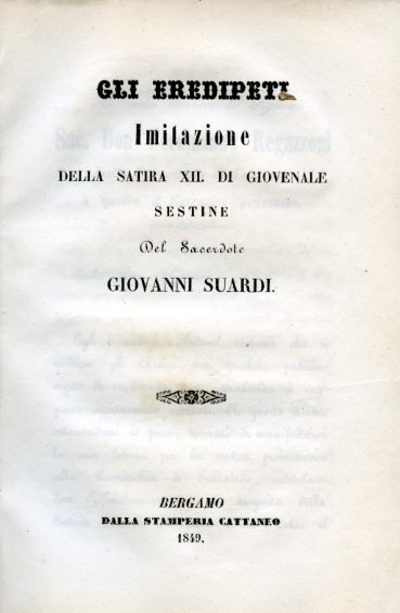 In-8°, pp. 15, brossura marmorizzata. Ottimo stato. Edizione originale. Imitazione della famosa satira di Giovenale diretta contro la bramosia di denaro di chi mira ad un'eredità.