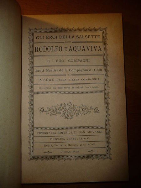 TITOLO: GLI EROI DELLA SALSETTE OSSIA RODOLFO D'AQUAVIVA E I SUOI COMPAGNI BEATI MARTIRI DELLA COMPAGNIA DI GESU' PEL P. SUAU DELLA STESSA COMPAGNIA DESCRIZIONE: Tipografia Editrice San Giovanni Roma 1893 rilegatura d'epoca in mez. pelle, piatti marmorizzati pp. 169 in 8°, con ill. b/n n.t. CONDIZIONI: Ottime, scritte di matita all'ultima bianca, e tracce di fox in alcune pagine. PESO / WEIGHT: 499 gr. without package