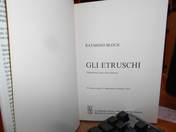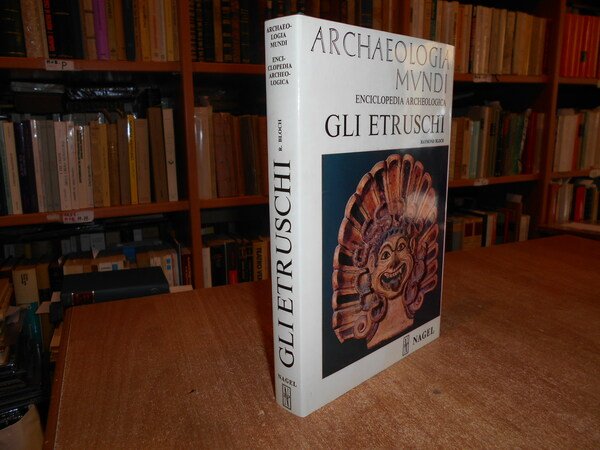 RAYMOND BLOCH. Roma, Nagel Edizioni, 1975. GLI ETRUSCHI. In-8°, similpelle verde con titolo in oro al dorso, sovracopertina ill. a col. 197 pp. con 61 tavole a colori; 71 illustrazioni in bianco e nero. Come nuovo. Uff. stanzetta mob. a sinistra
