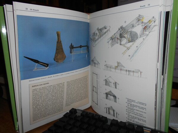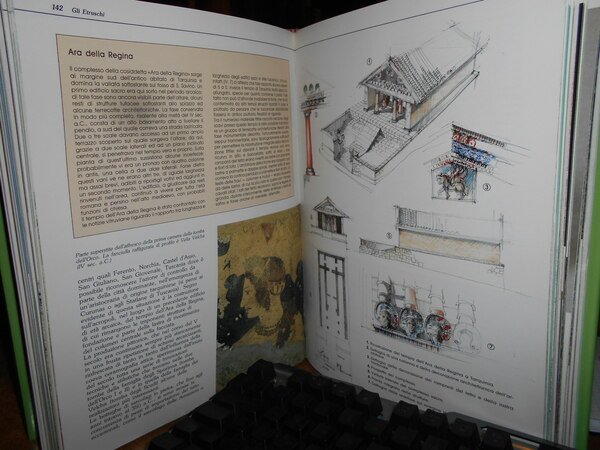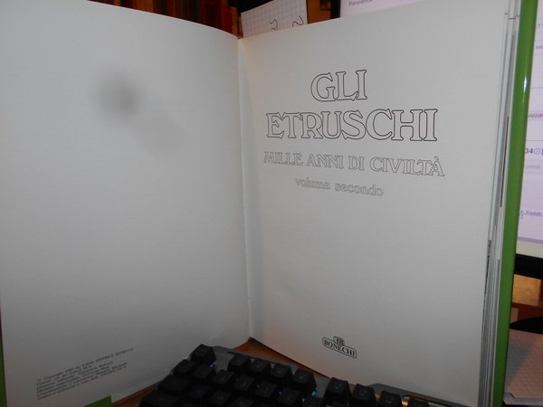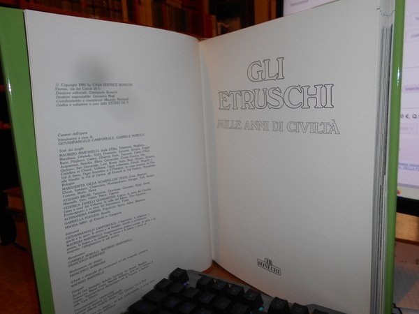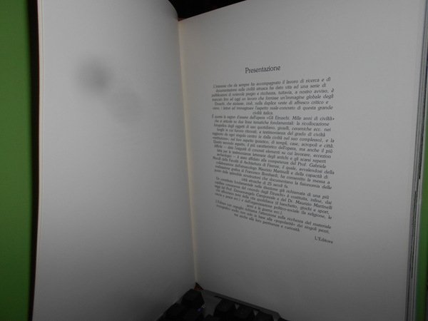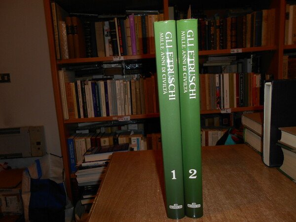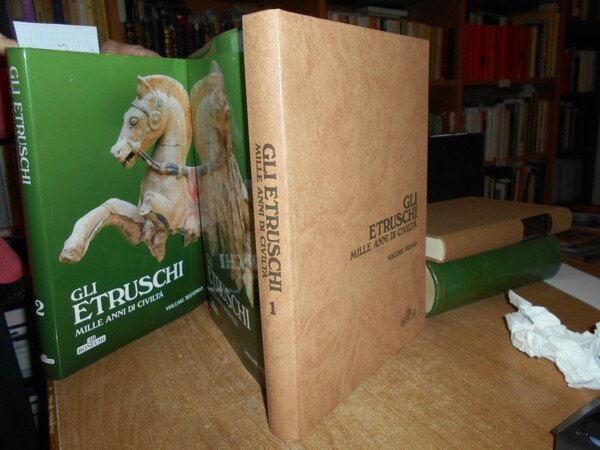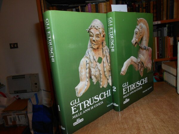 AA. VV. Firenze, Bonechi Editore, 1985. GLI ETRUSCHI. Mille anni di civiltà. 2 volumi in-4°, cartonato edit. con titoli ai dorsi e sui piani, sovracopertine ill. a col. (iv), 642 pp. con innumerevoli illustrazioni a colori n.t. Come nuovi. Uff. stanzetta mob. a destra